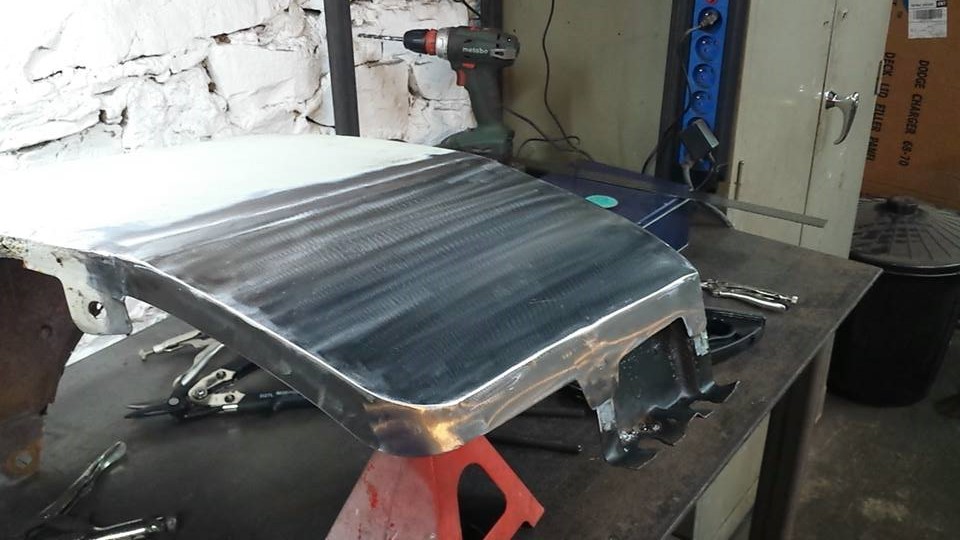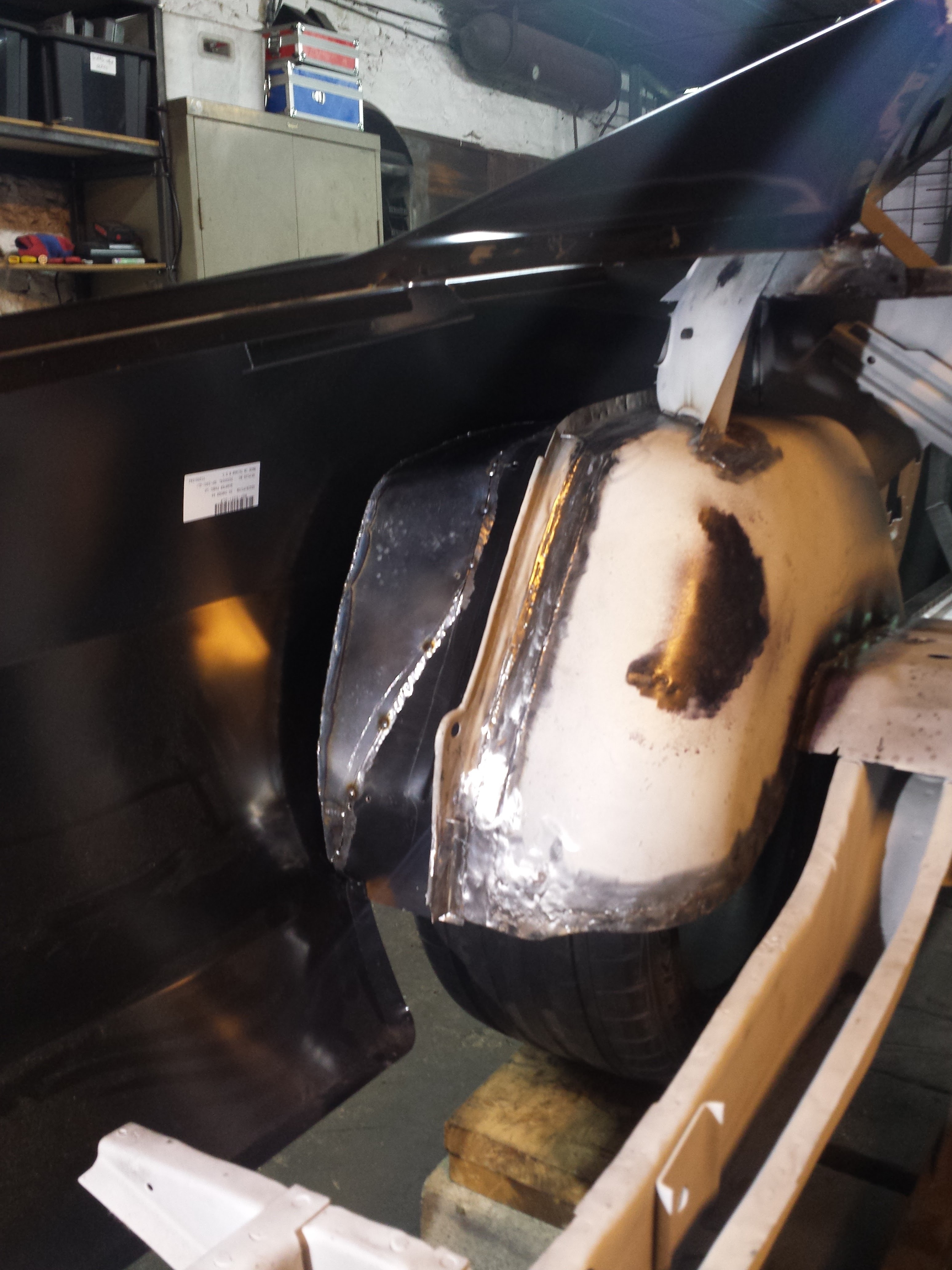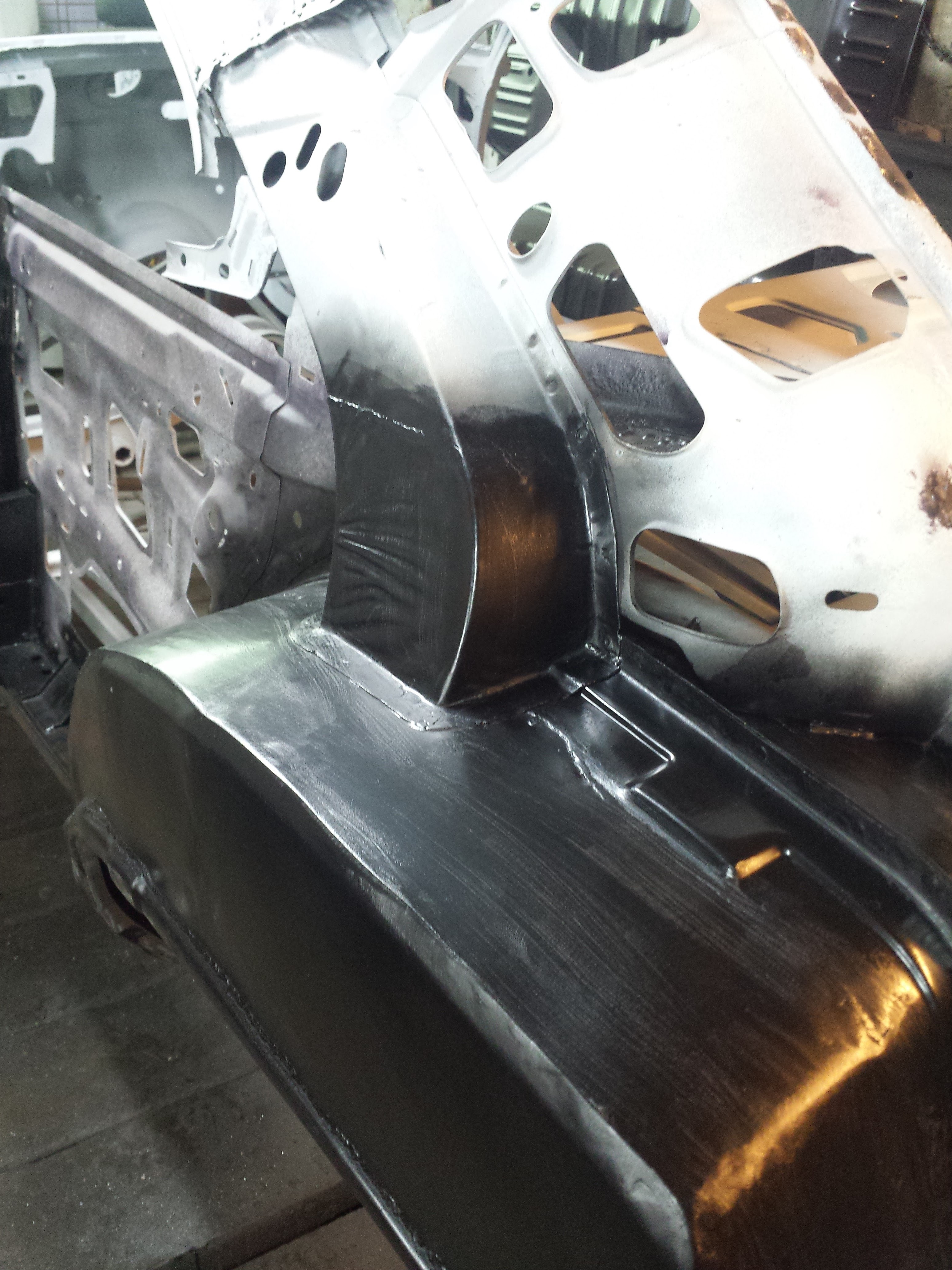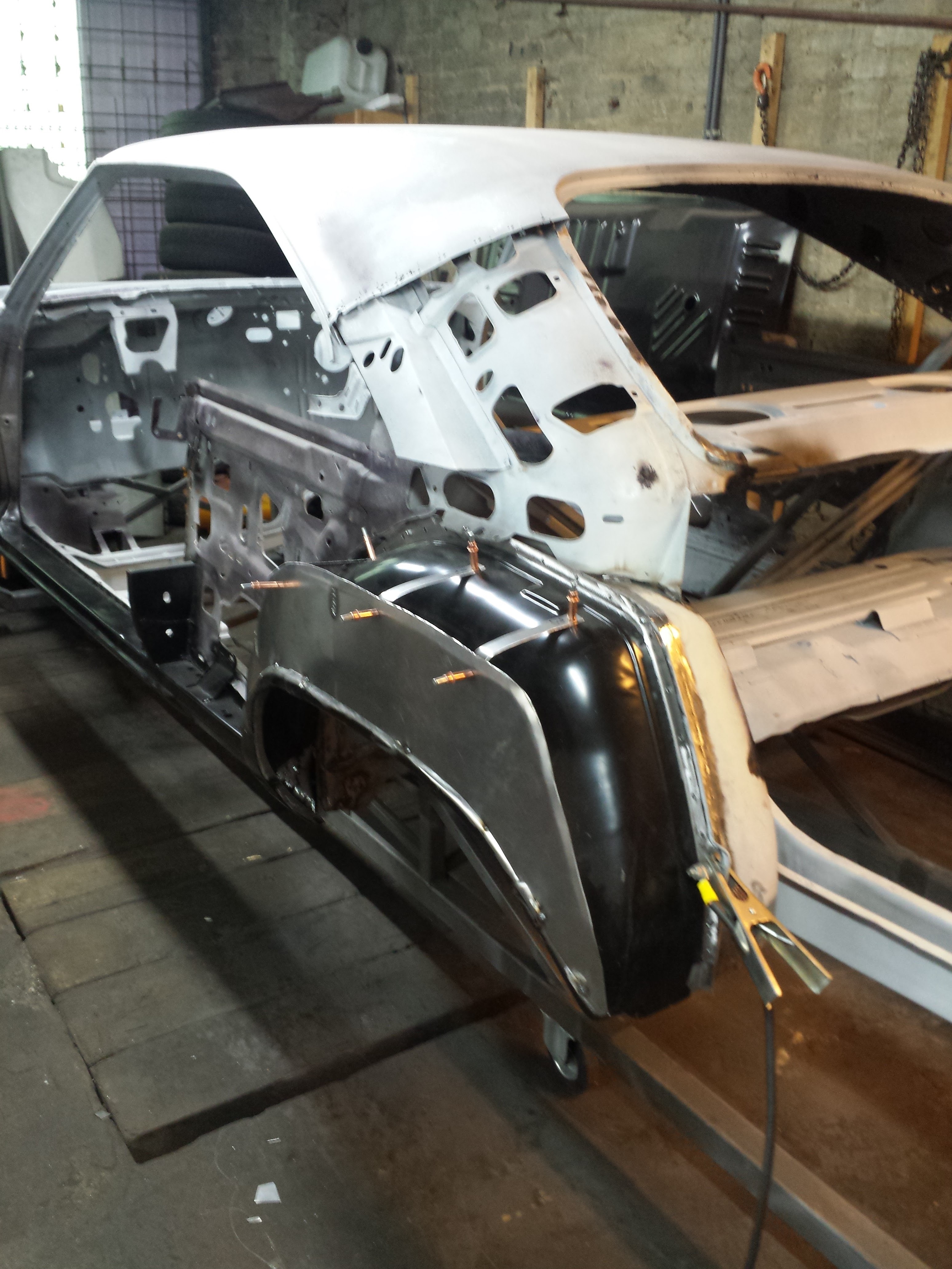 Meulages, meulage et encore meulage. Puis repositionnement du renfort de toit qu'il a fallu adapter à la nouvelle forme du passage de roue et une barbouille antirouille pour le temps des travaux (ça sera passé au 120/240/320 avant apprêtage, du moins sur la partie arrière qui est visible quand on ouvre le coffre.