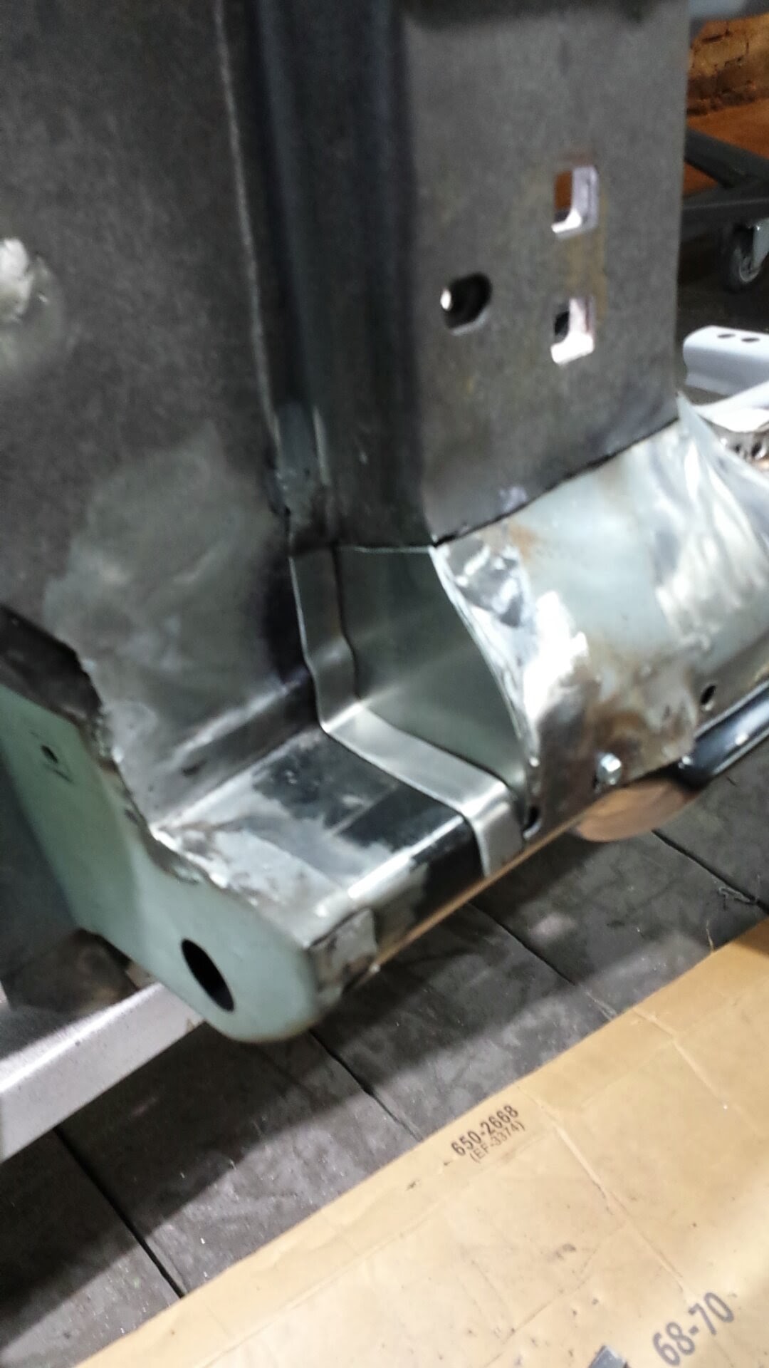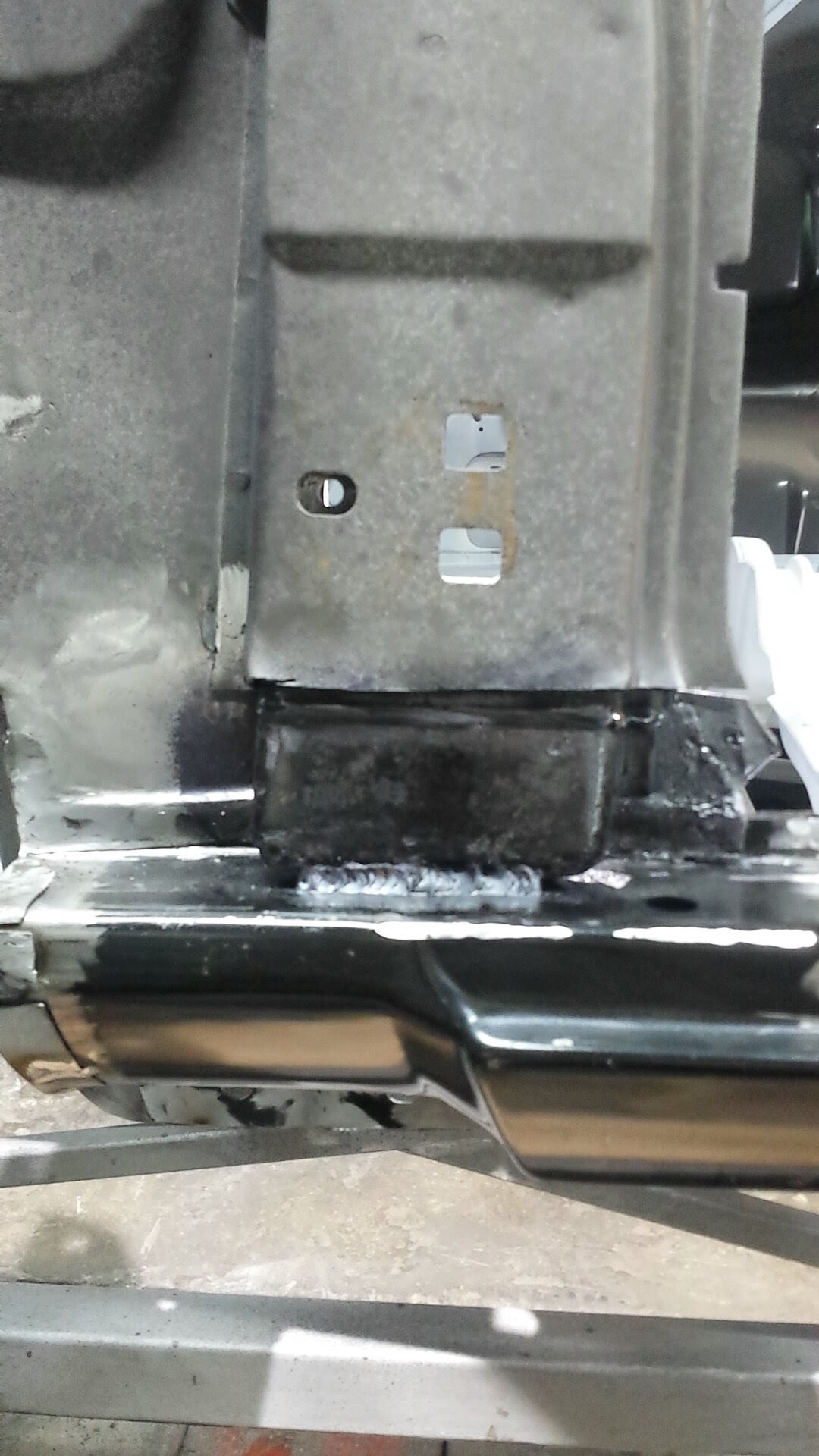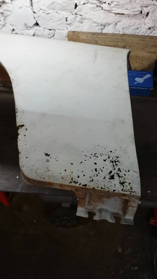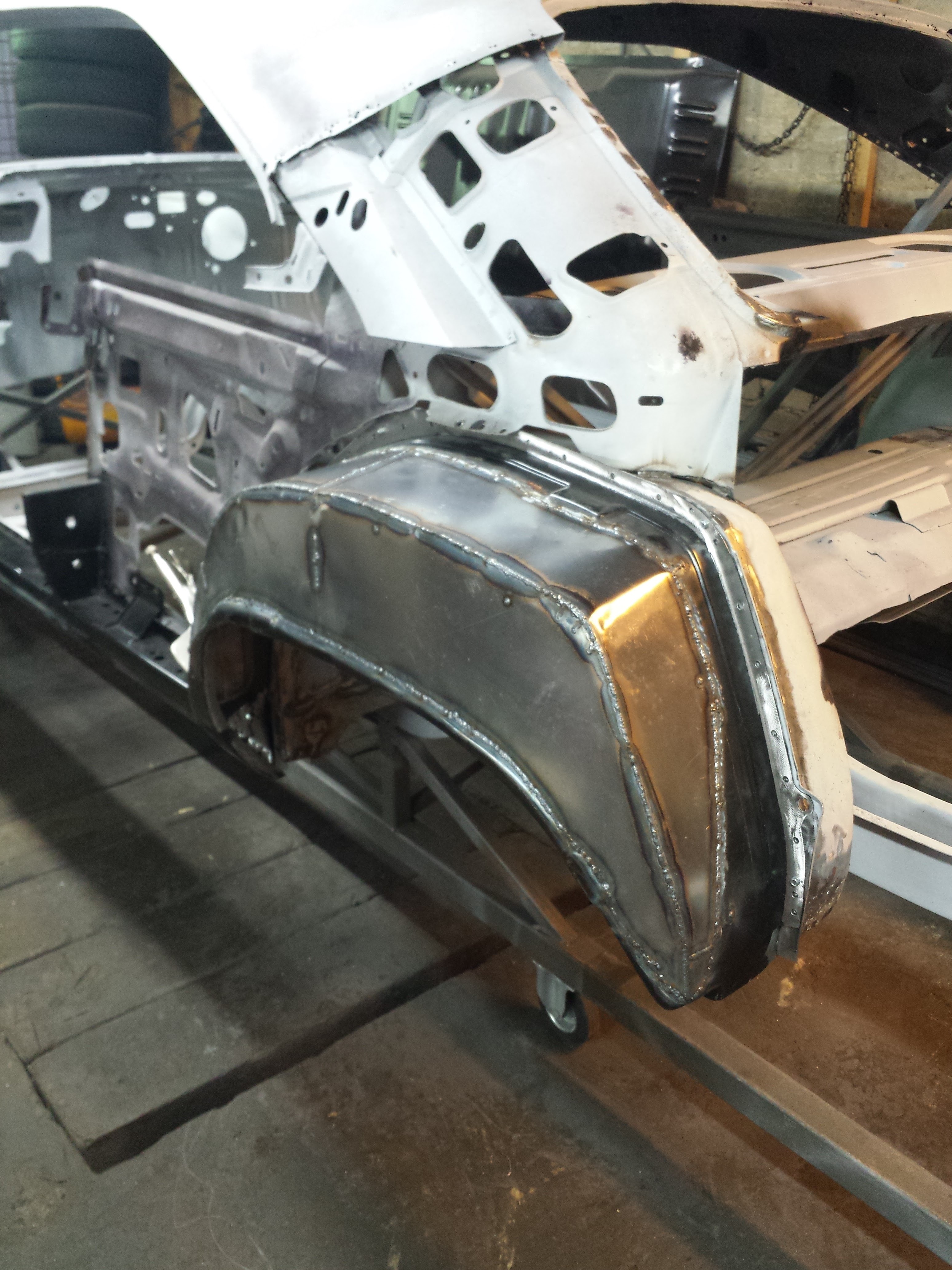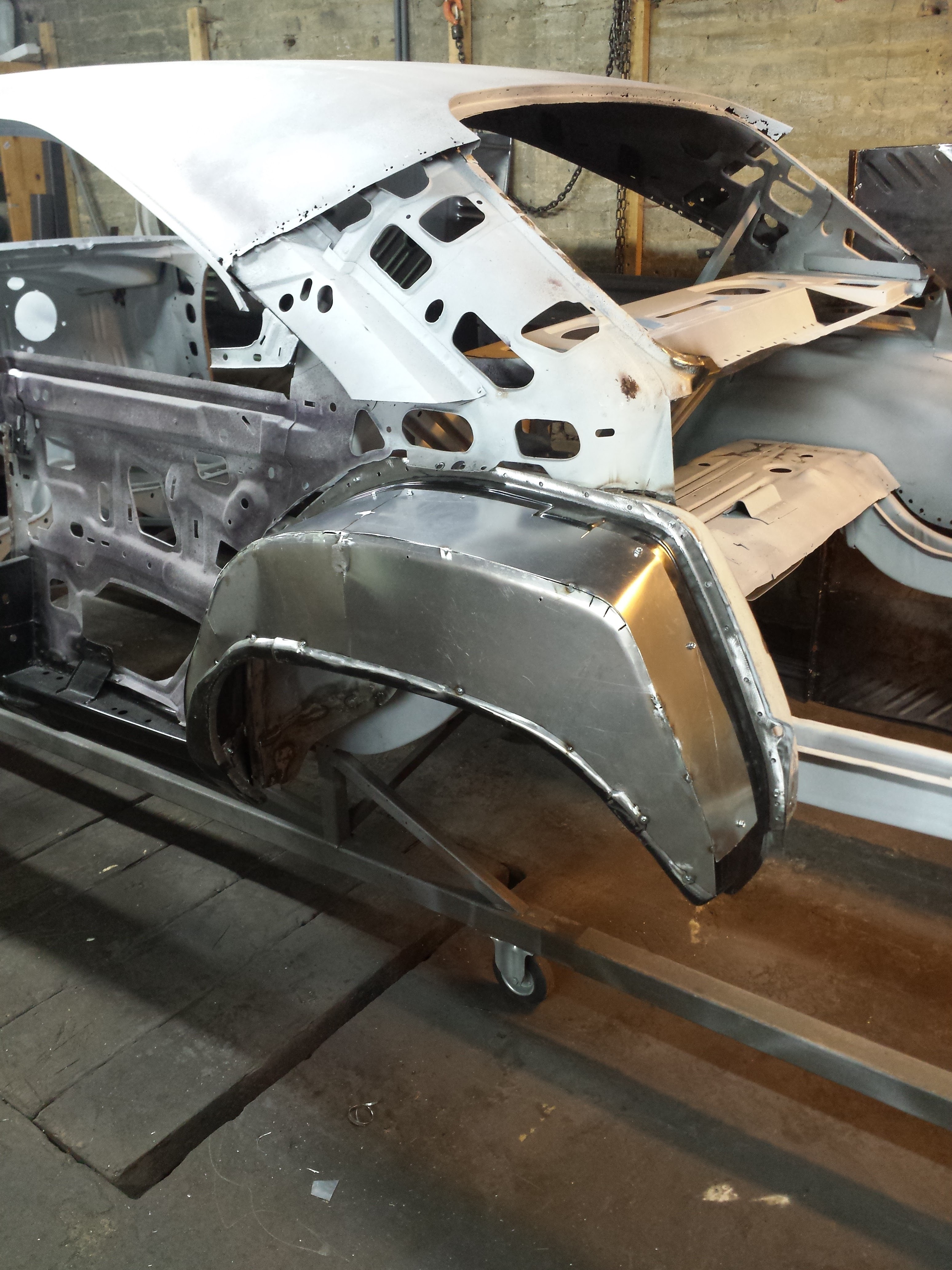 Meulages, meulage et encore meulage. Puis repositionnement du renfort de toit qu'il a fallu adapter à la nouvelle forme du passage de roue et une barbouille antirouille pour le temps des travaux (ça sera passé au 120/240/320 avant apprêtage, du moins sur la partie arrière qui est visible quand on ouvre le coffre.
