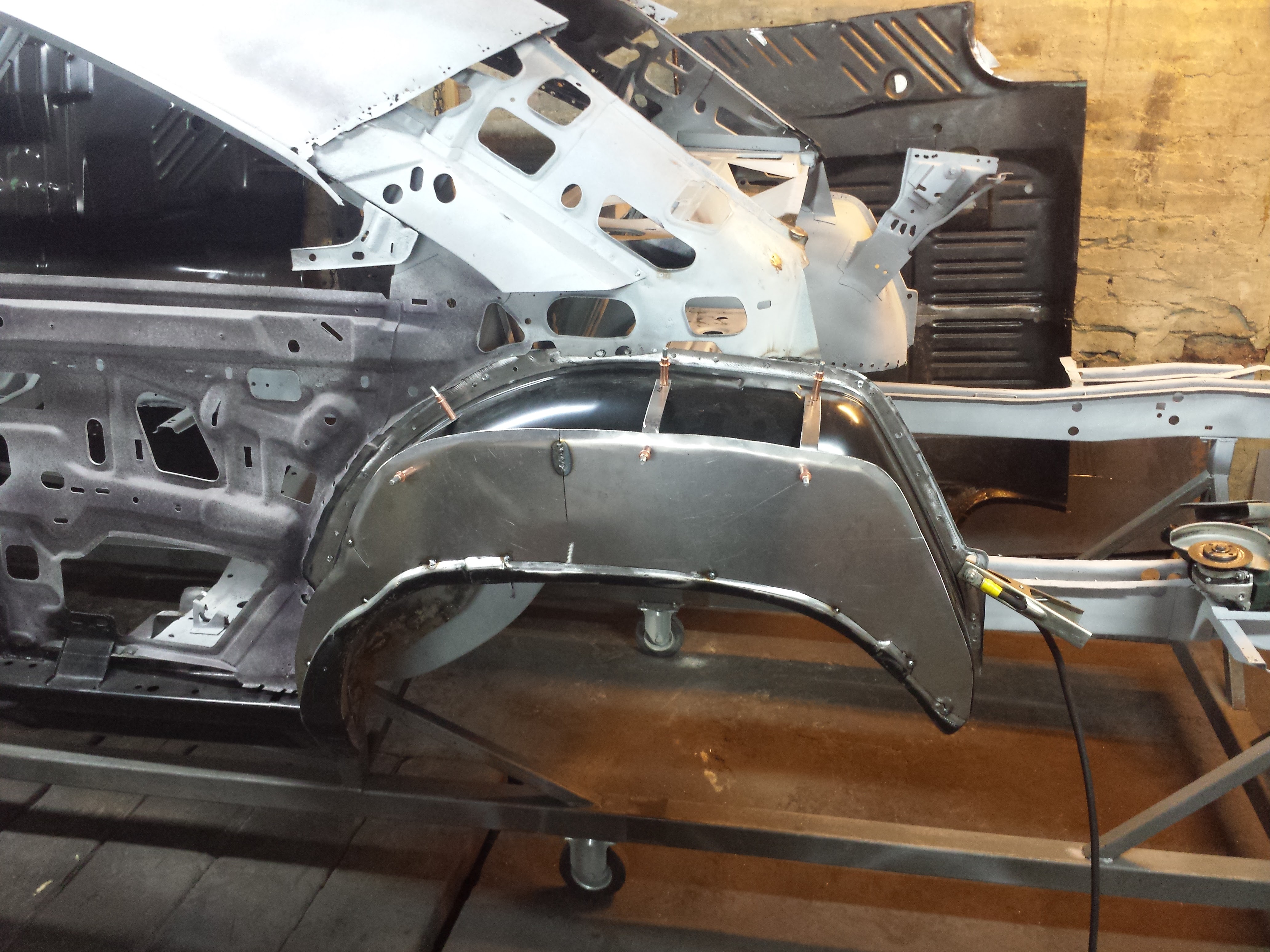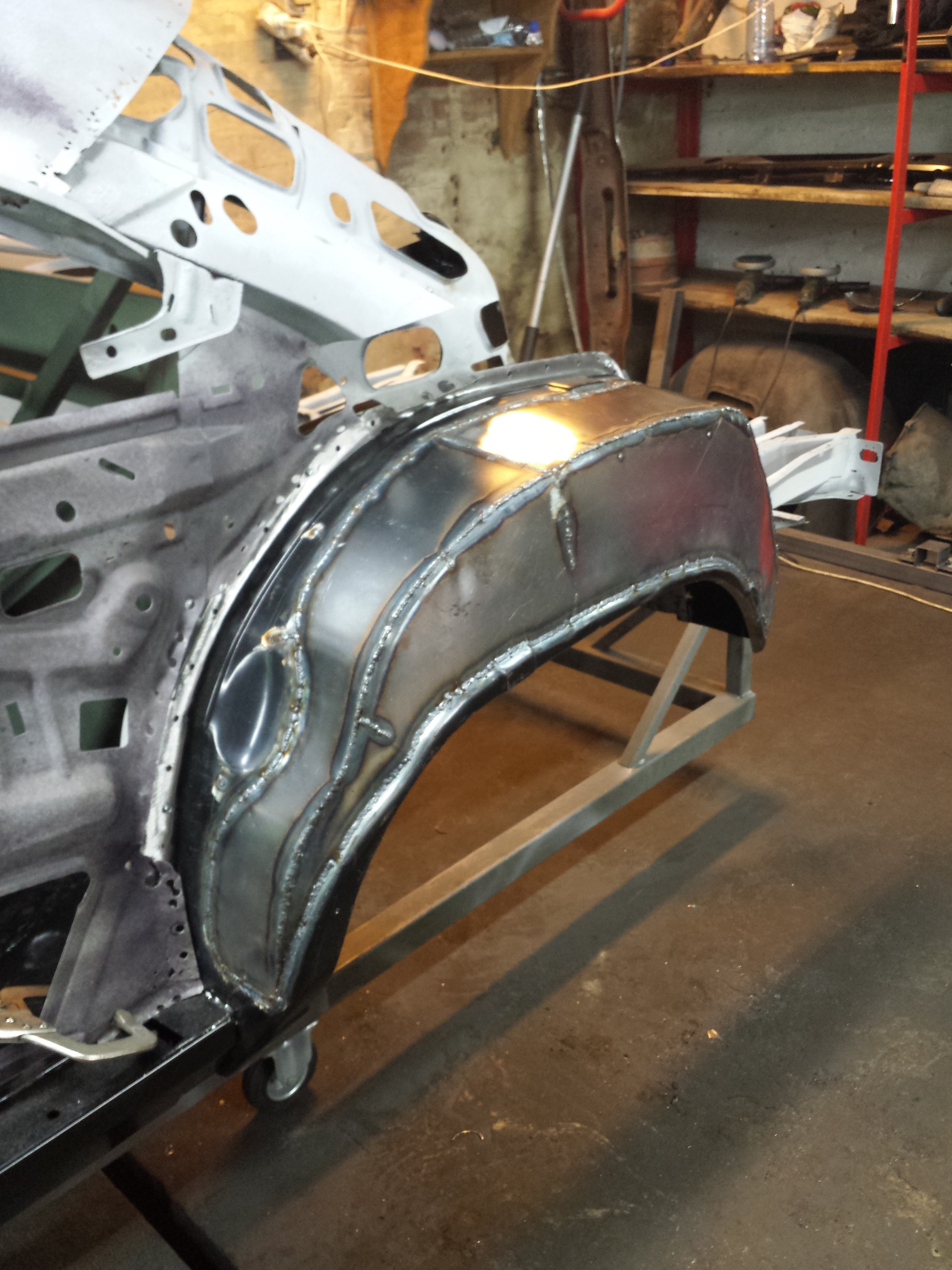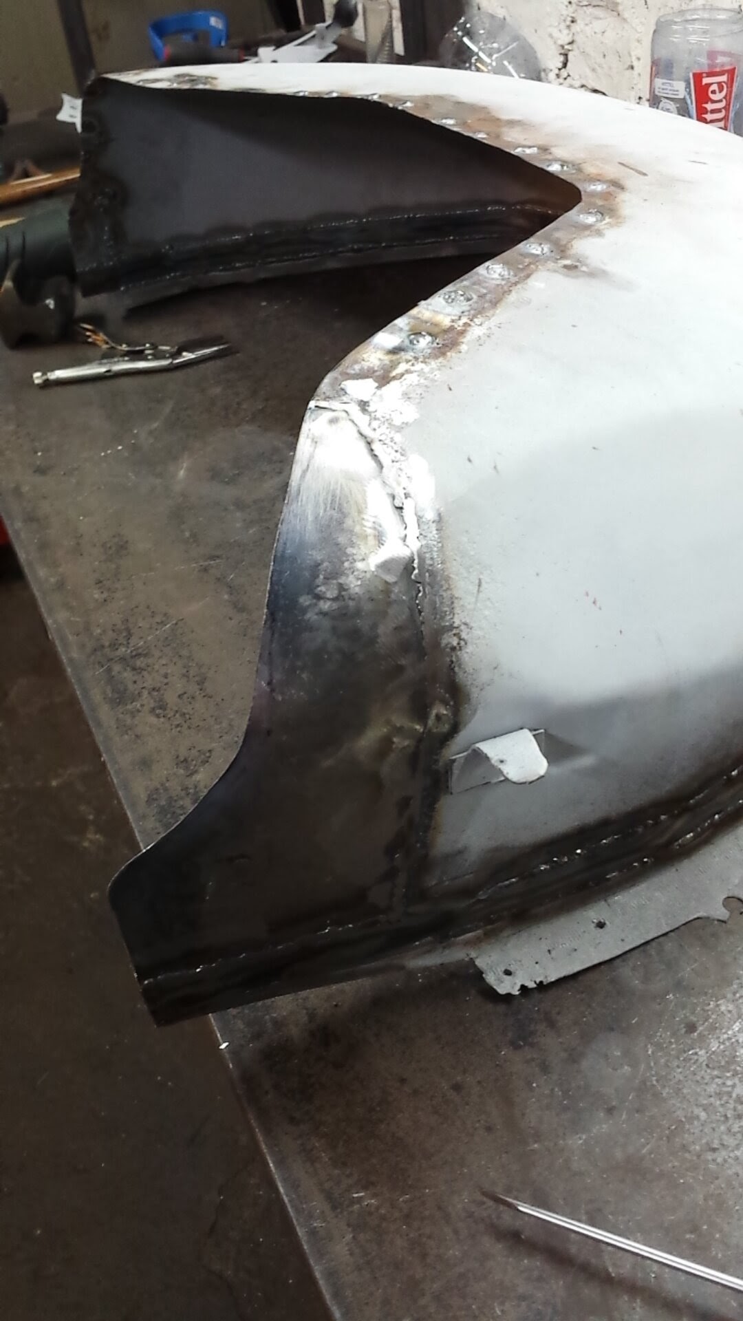 Après la repose et soudure du passage de roue intérieur, ajustage de l'extérieur puis modification de celui ci. Et la c'est un gros boulot, parce que la lèvre venant se souder a l'aile doit rester exactement à sa place dans les trois dimensions, sous peine de ... Ne plus pouvoir repositionner l'aile exactement! Je construit donc le nouveau passage de roue SUR l'origine puis par une technique assez simple, je retire la partie d'origine juste avant la soudure finale. Ainsi je conserve ce qui m'intéresse sur l'origine.