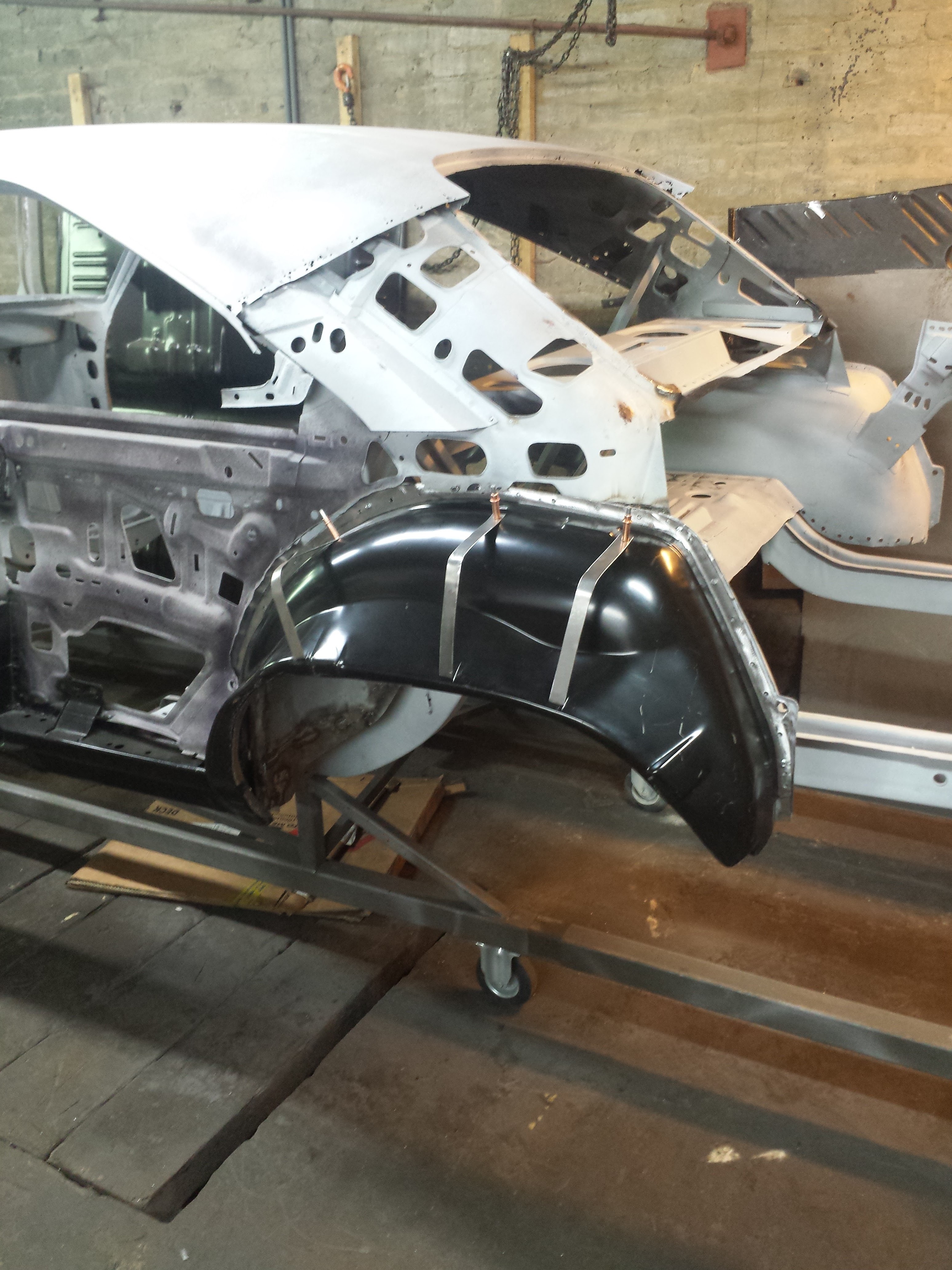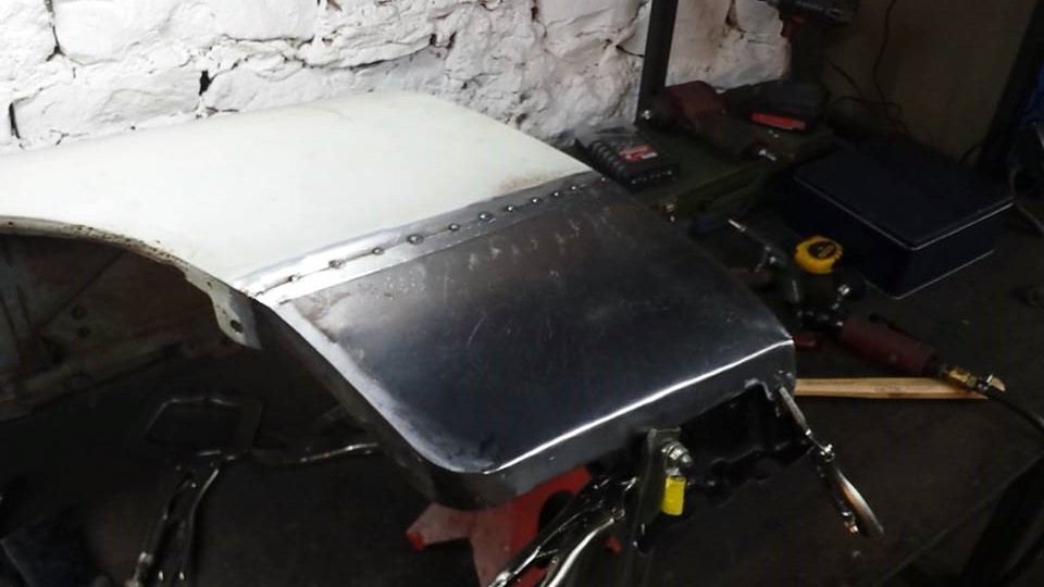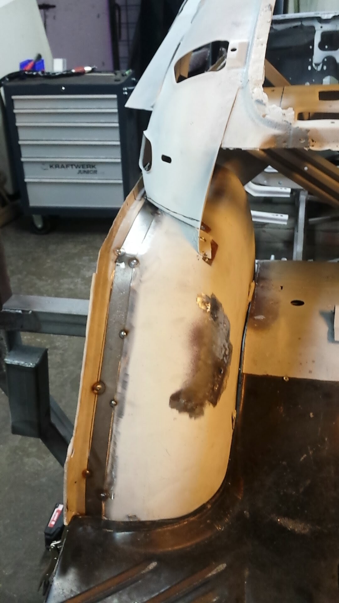 Après la repose et soudure du passage de roue intérieur, ajustage de l'extérieur puis modification de celui ci. Et la c'est un gros boulot, parce que la lèvre venant se souder a l'aile doit rester exactement à sa place dans les trois dimensions, sous peine de ... Ne plus pouvoir repositionner l'aile exactement! Je construit donc le nouveau passage de roue SUR l'origine puis par une technique assez simple, je retire la partie d'origine juste avant la soudure finale. Ainsi je conserve ce qui m'intéresse sur l'origine.