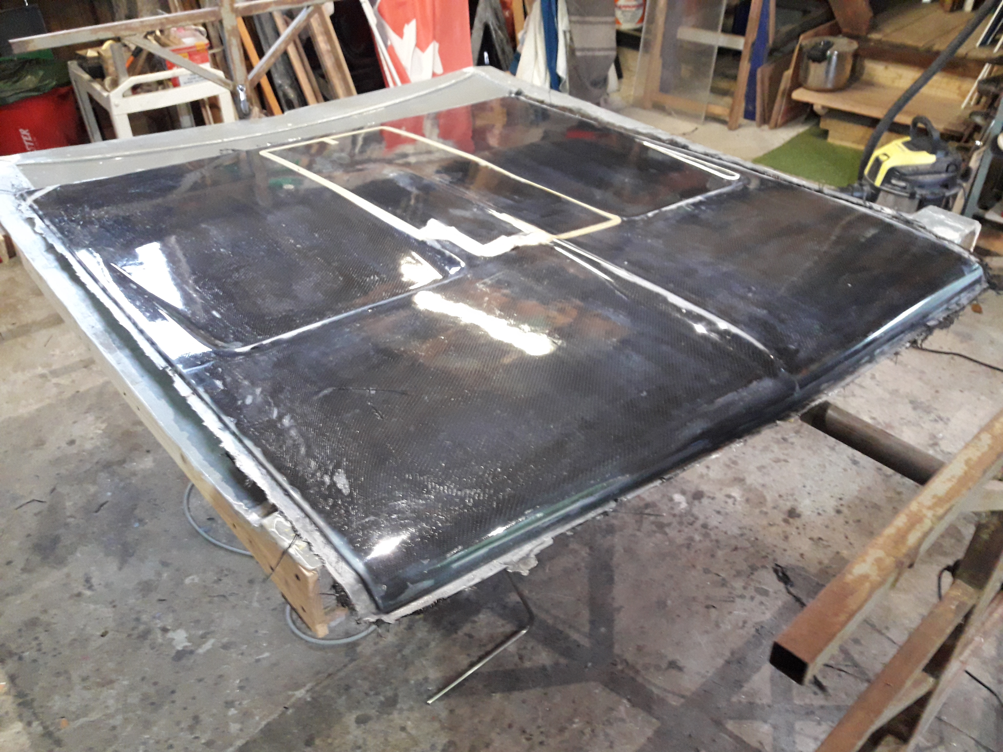 Déterrage de post ! Petite nouveauté pour changer de la fibre de verre, le carbone epoxy ! Donc voici un capot pour une Charger 68, avec en prime, un trou béant au milieu, devinez pour quoi ! Il n'est pas encore fini, reste un peu de finition.