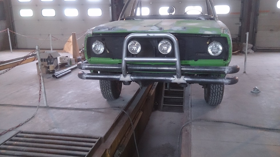 Pour l'arceau, on le fabriquera avec du tube acier de 88.9. Pour le par-buffle, on utilisera un par buffle de Rav4 qui s'enquille parfaitement sur lequel on soudera deux tubes acier de même diamètre. Idem pour le marchepied, mêmes tubes.