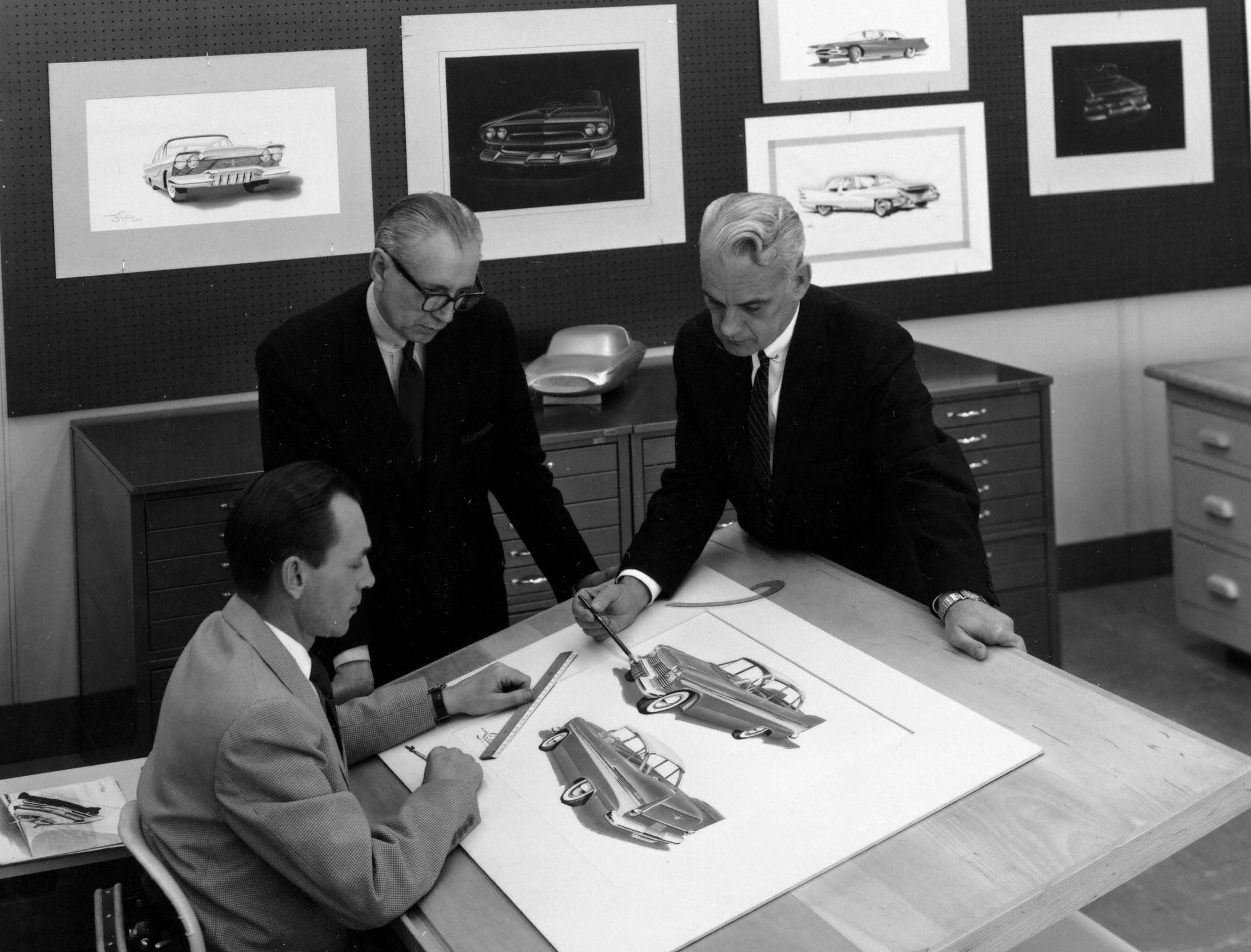 Merci, c'est lui qui a tout fait, retour en 1956, Virgil Exner dessine la bête dans les bureaux de Détroit, un designer de génie