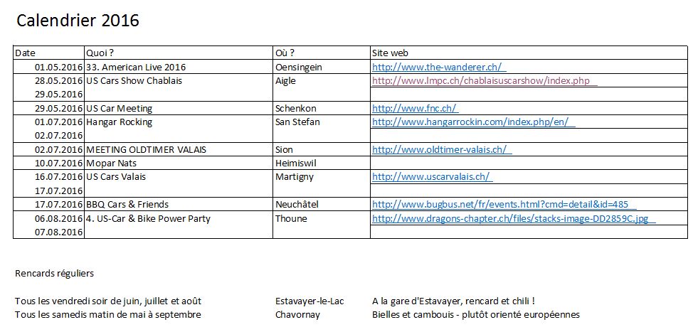 Voici quelques rencards et concentrations pour 2016. Petit coup de cœur pour l'US Car Show Chablais en faveur d'une fondation pour école de chiens d'aveugle :clap: .