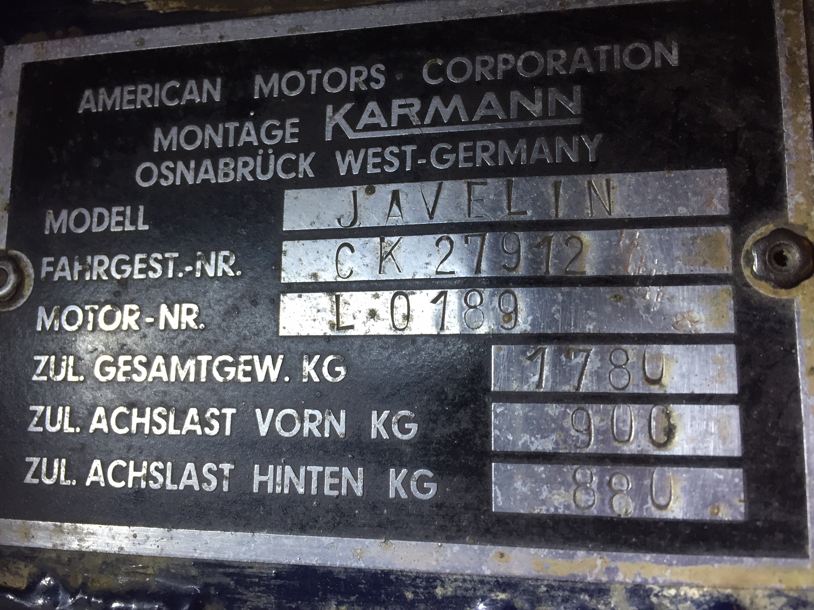 Je suis un tout nouveau et heureux propriétaire d'une AMC Javelin de 1970, qui a la particularité d'avoir été fabriquée chez Karmann en Allemagne.