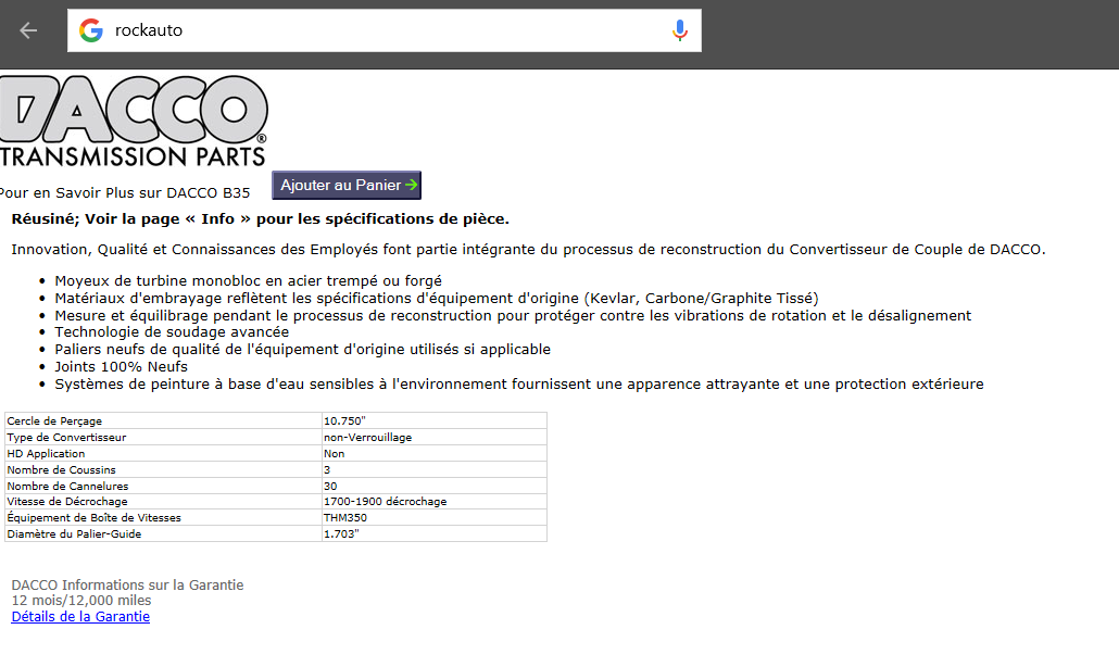 Mon frère doit refaire sa boite de vitesse TH350 et changer le convertisseur.Rockauto lui conseille celui-ci: