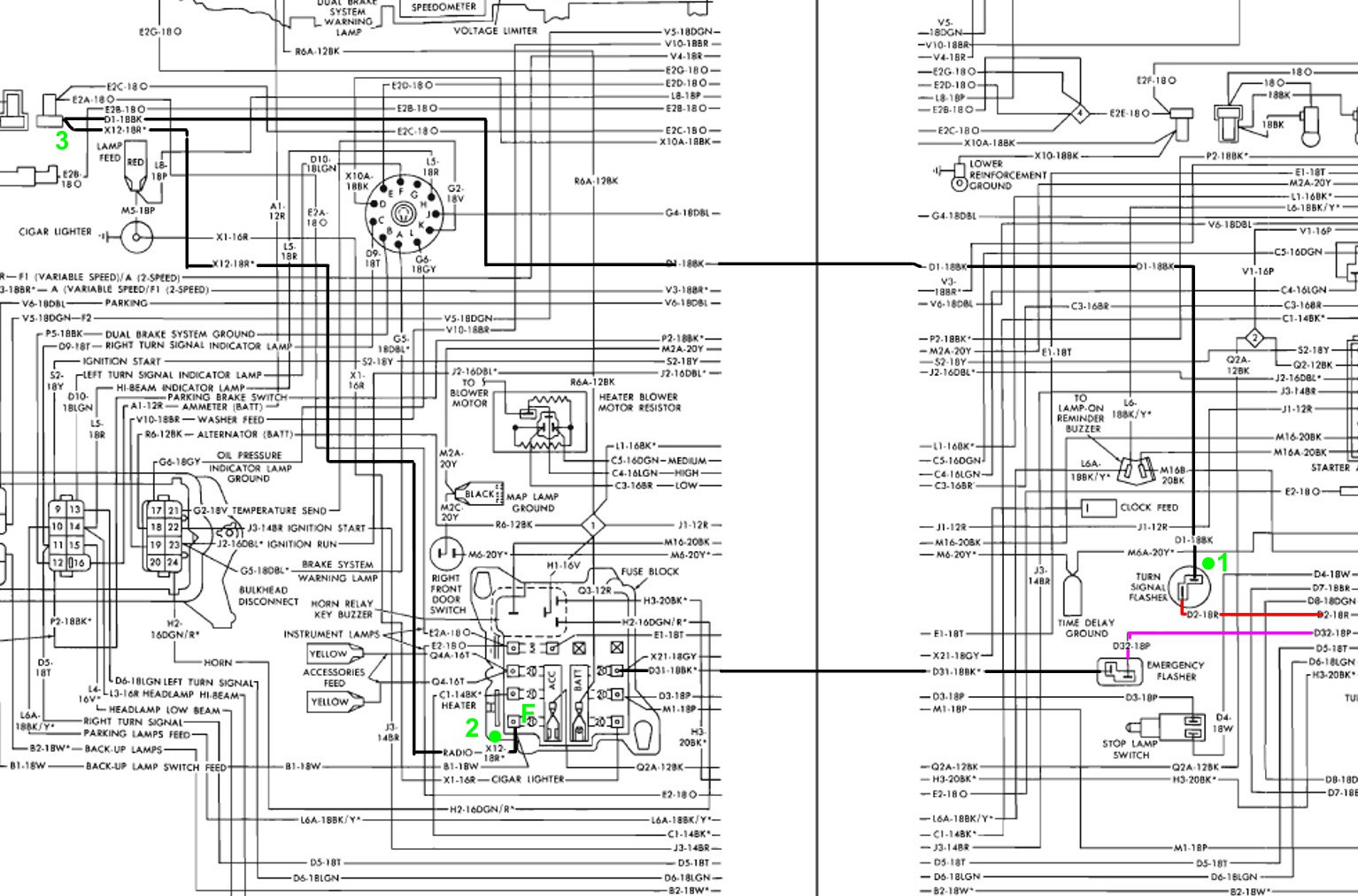 Si tu n'as rien sur la centrale clignotant (sur la cosse débranchée de la centrale, point 1) c'est que le fusible correspondant (F) est peut être HS ou ne fait pas contact. Il faut donc vérifier au départ (point 2) sur la boîte à fusible s'il y a 12 V. Attention aussi à une connexion au point 3, il semble que c'est sur la radio ou pas loin, (là aussi faut vérifier). Tous ces tests avec le contact.