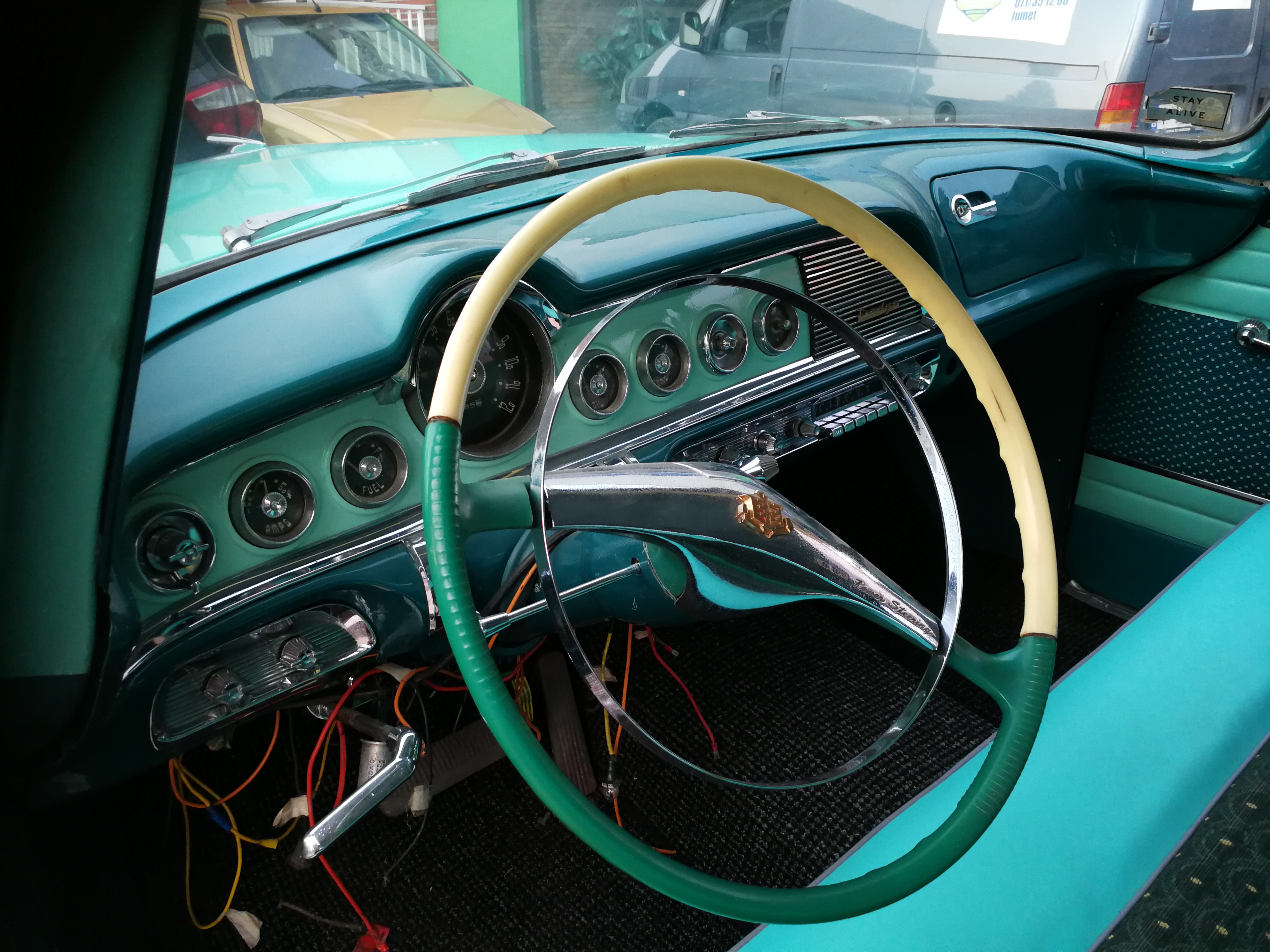 C'est donc une dodge custom royal de 1955 avec le 270ci (4.4L) V8 hemi super red ram de 193cv, la peinture a été faite il y a 3 ans, l'intérieur pareil, frein complet et échappement complet neuf, il reste à finir le ciel de toit, le pare choc arrière à chrômer et le plus délicat le faisceaux électrique