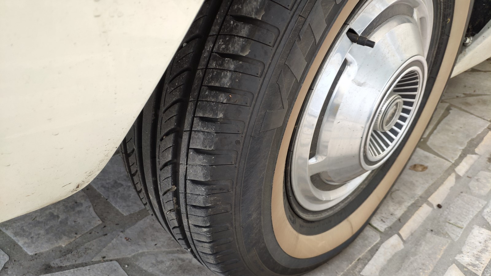 Je vais tester une autre marque de pneu (finlandaise), car ils proposent des radiaux à grand flanc blanc à des prix disons ... corrects ! Et en plus en 14" ! 225 € pièce soit presque 200€ de moins que les Coker ou BF Goodrich. C'est la marque Kontio, https://kontiotyres.com/ Il me fallait des 225-75 x 14 pour remplacer les 8.50 x 14 diagonaux dont est affublé mon nouveau jouet ....