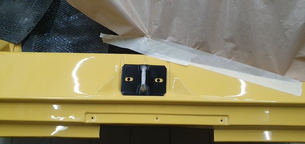 La tôle autour du radiateur était souvent rebarbouillée en noir mat après le passage en peinture pour éviter que l'on voit la couleur (jaune chez toi) au travers de la calandre lorsqu'elle sera remontée.