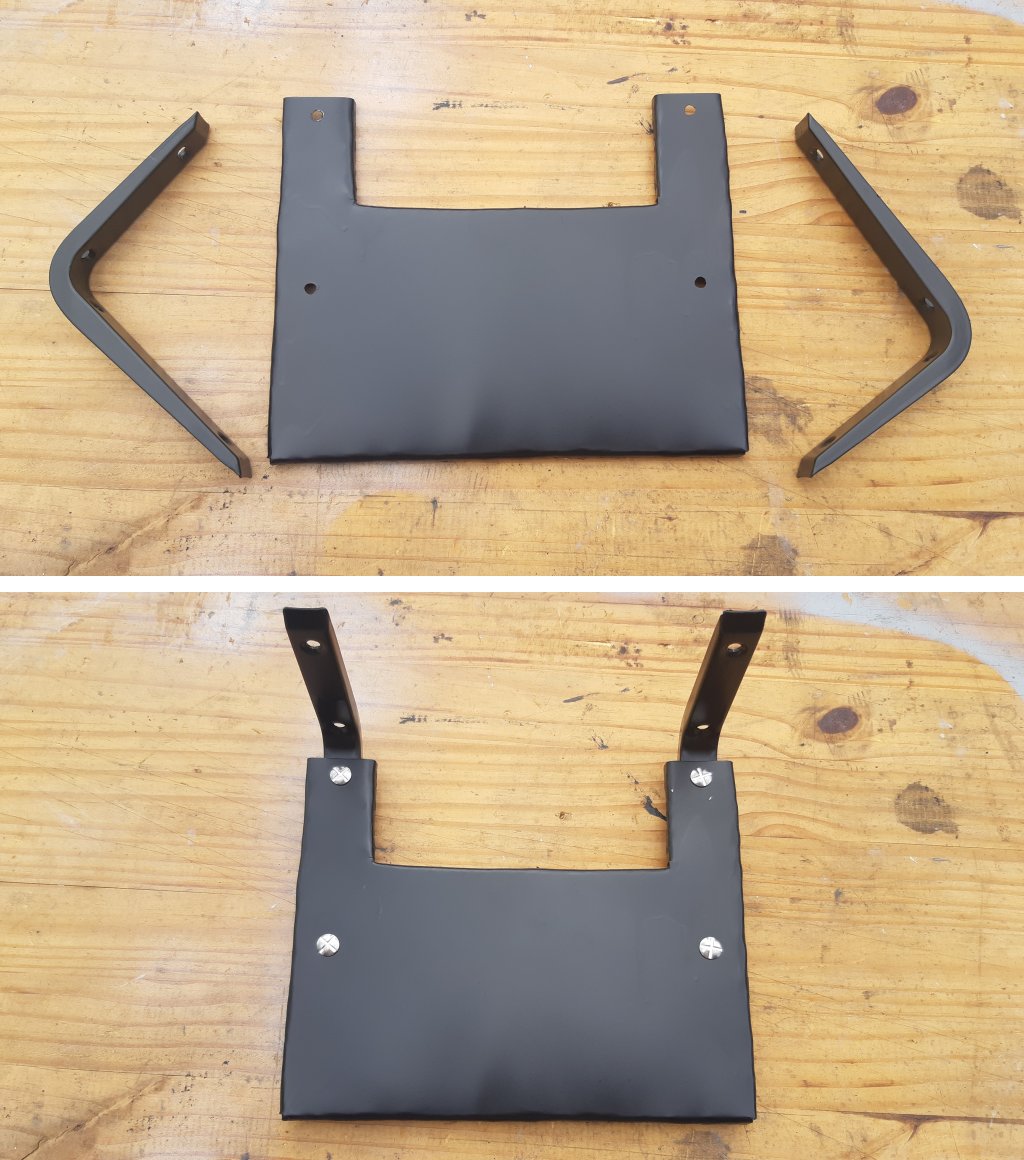 Achat des matières premières, 2 équerres métalliques pour étagères et une tôle d'alu de 1,5mm Découpe et mise en forme de la tôle pour créer des renforts Mise en apprêt et peinture Et finalement le montage, ça a quand même une autre gueule comme ça
