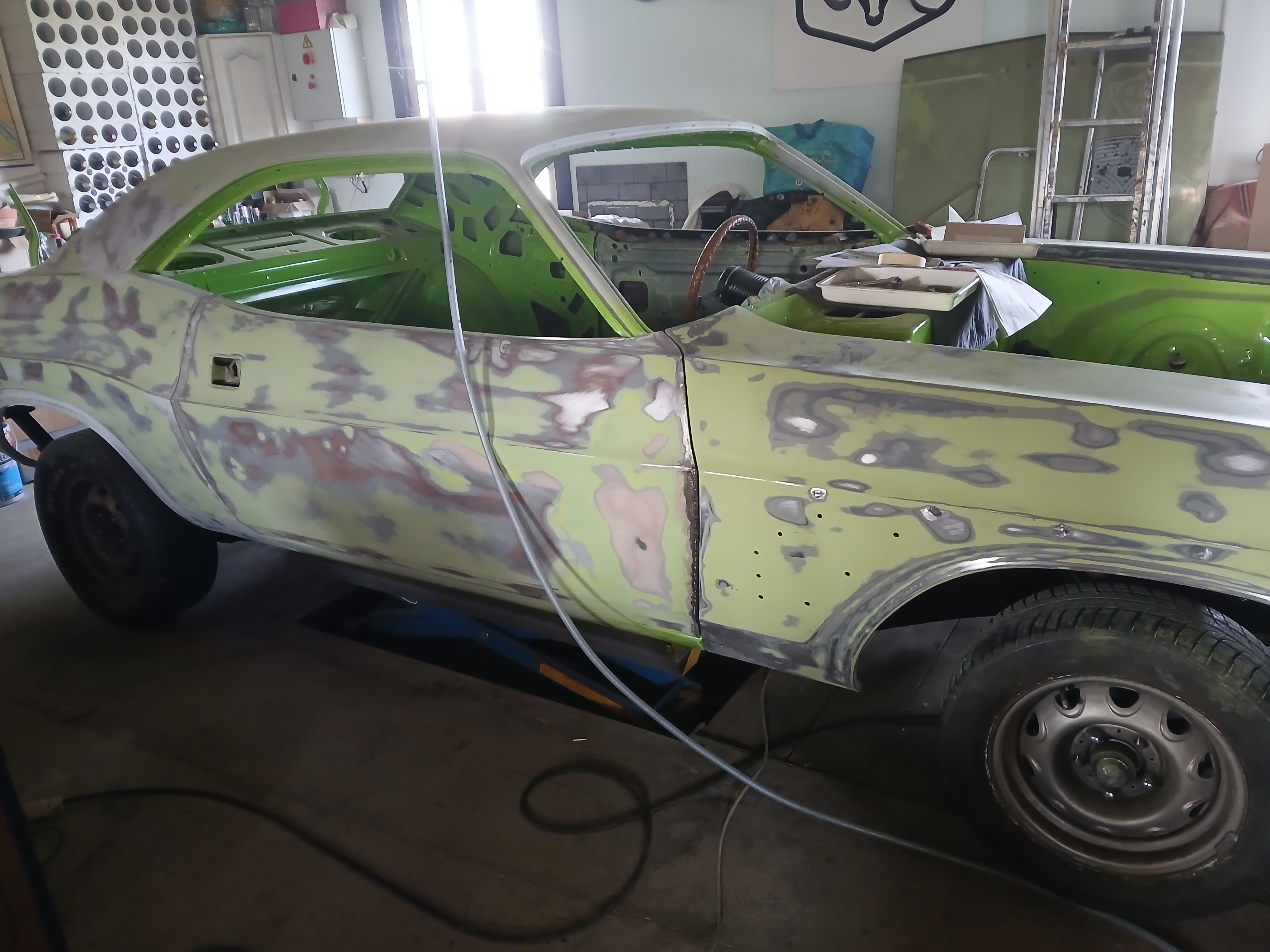 Apres la soudure est venu le temps du décapage. Ponçage de la carosserie afin d'enlever le plus gros de la peinture d'origine.