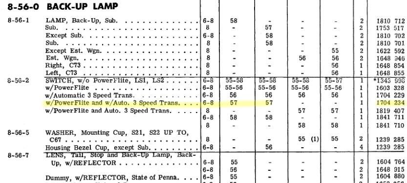 Je viens de consulter mon parts manual 57 (canadien, j'ai pas regardé le US) et il y a 2 modèles de "back-up light switch" de listé, l'un sur le pushbutton, l'autre sur la boîte:
