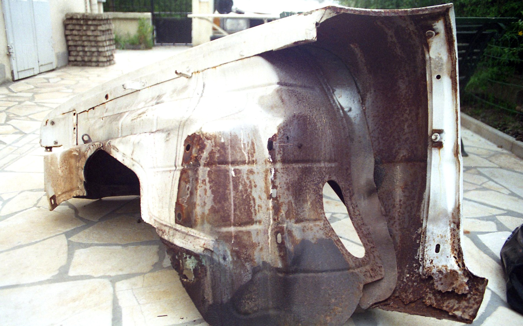 A propos de la classique rouille en bas des ailes Av, côté porte, voici comment était l'aile AvD de la mienne (sans vraiment être très visible de l'extérieur). Le renfort est bouffé et il a fallu un peu reconstruire à cet endroit car l'aile se fixe sur le châssis. C'est un grand classique, boue, feuilles, eztc... s'accumulent et macèrent, l'évacuation se bouche et ....