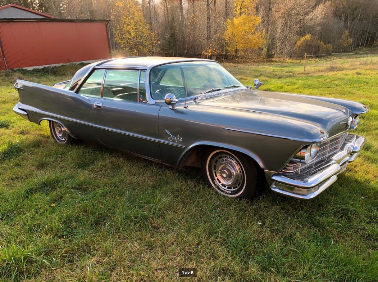 Une "Custom" berline hardtop 58 à 27000€ : ici, avec des enjoliveurs de Crown 58, le Mirrormatic de 59, et l'Autopilot 58 (on voit le contrôle sous l'horloge). La couleur du haut du tableau de bord est erronée, mais le reste semble très beau. Sous le capot, le Hemi 392, et pas le Wedge 413. Le propriétaire l'a depuis 20 ans.