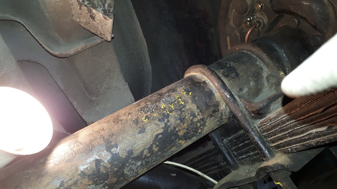 Un X jaune sur le nez de pont 489 Des marques blanches et jaunes sur les U-bolts. Le tag 3,23 d'origine était toujours sur son boulon de pont (celui à 15h00)