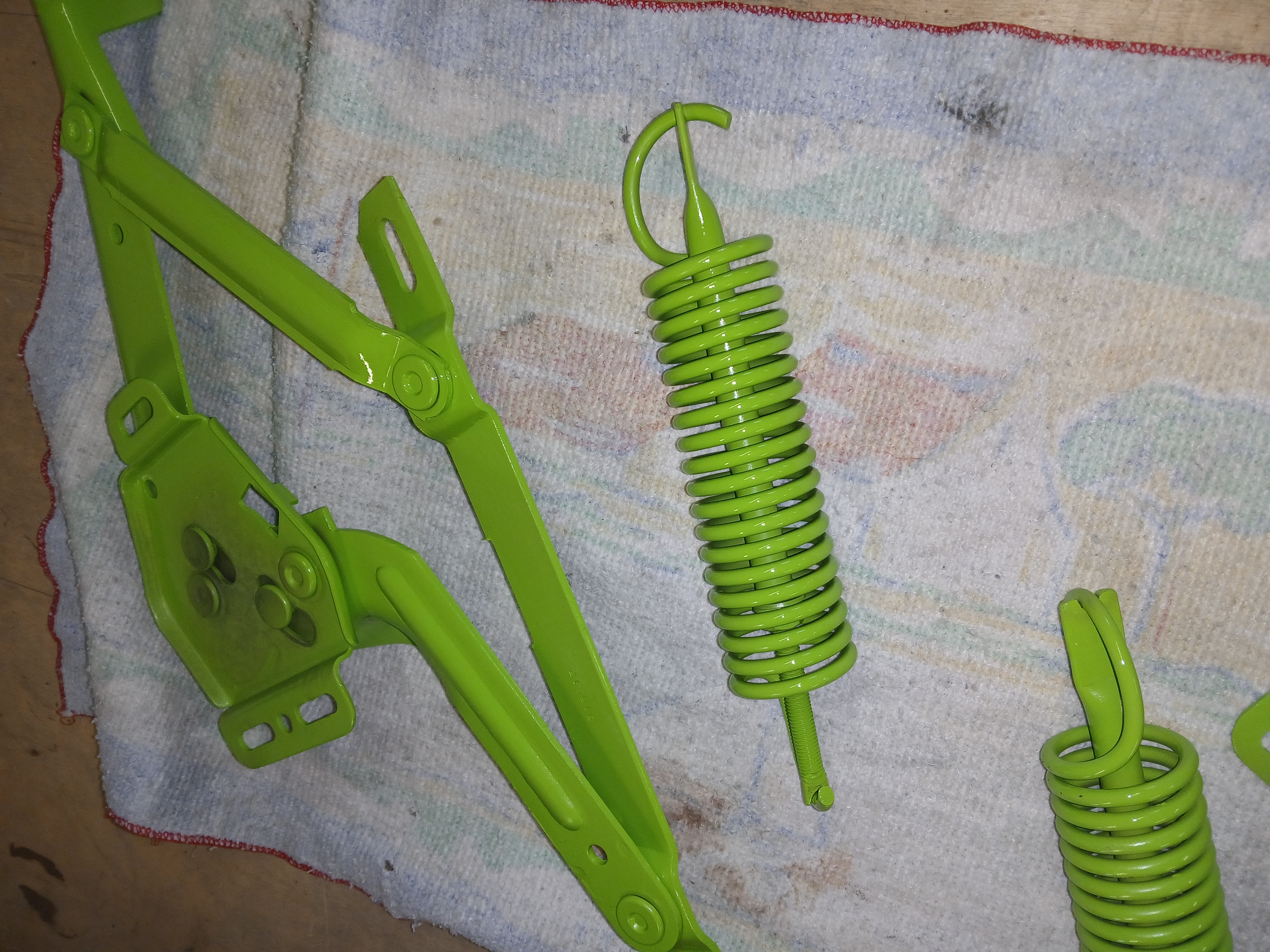 un coup de peinture sur les compas de capot, puis remise en place des ressorts