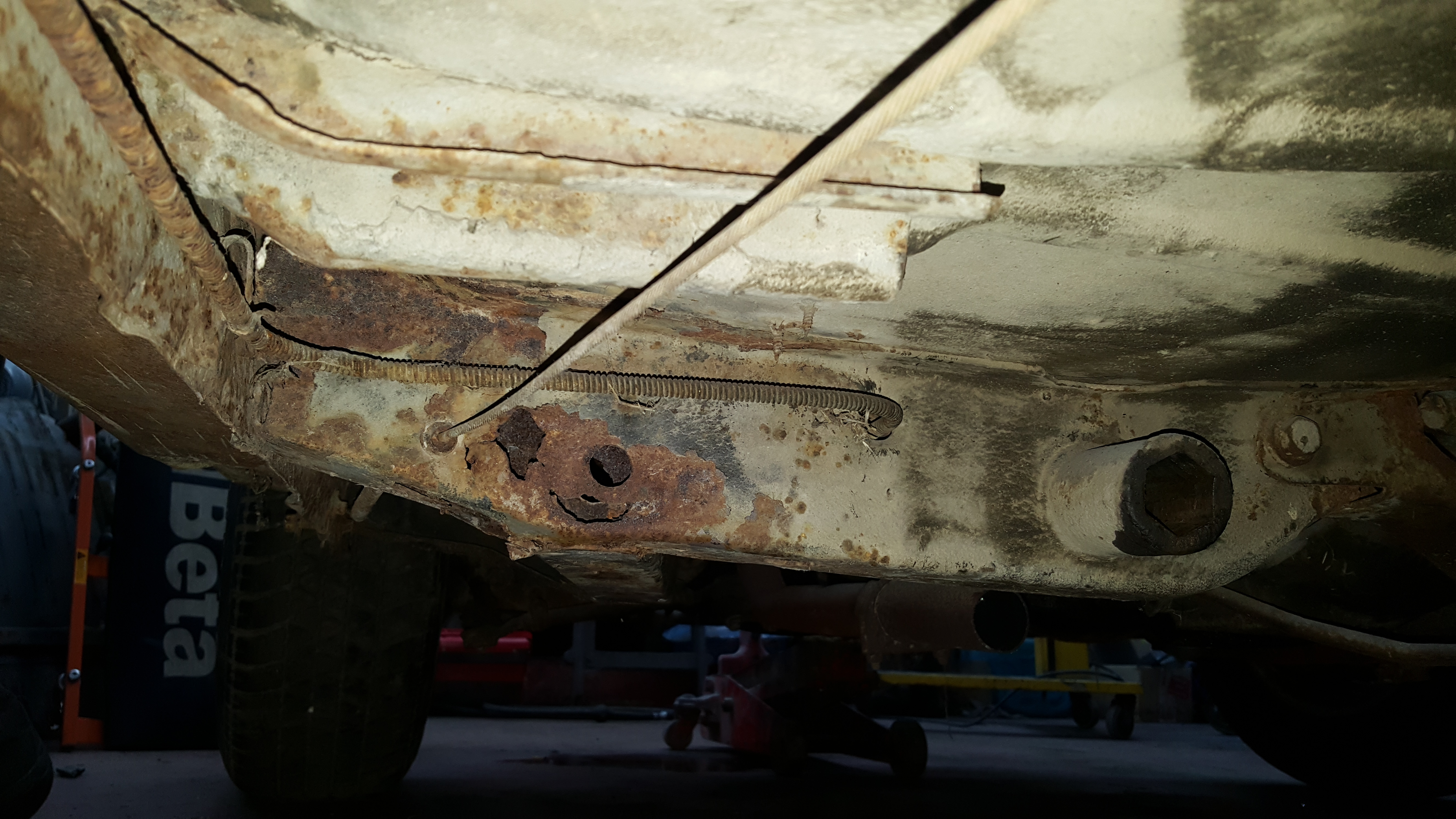 Pour je ne sais quelle raison, ils ont découpé la partie tunnel du longeron et du coups de le longeron ne tiens plus que par le support de boîte de vitesse