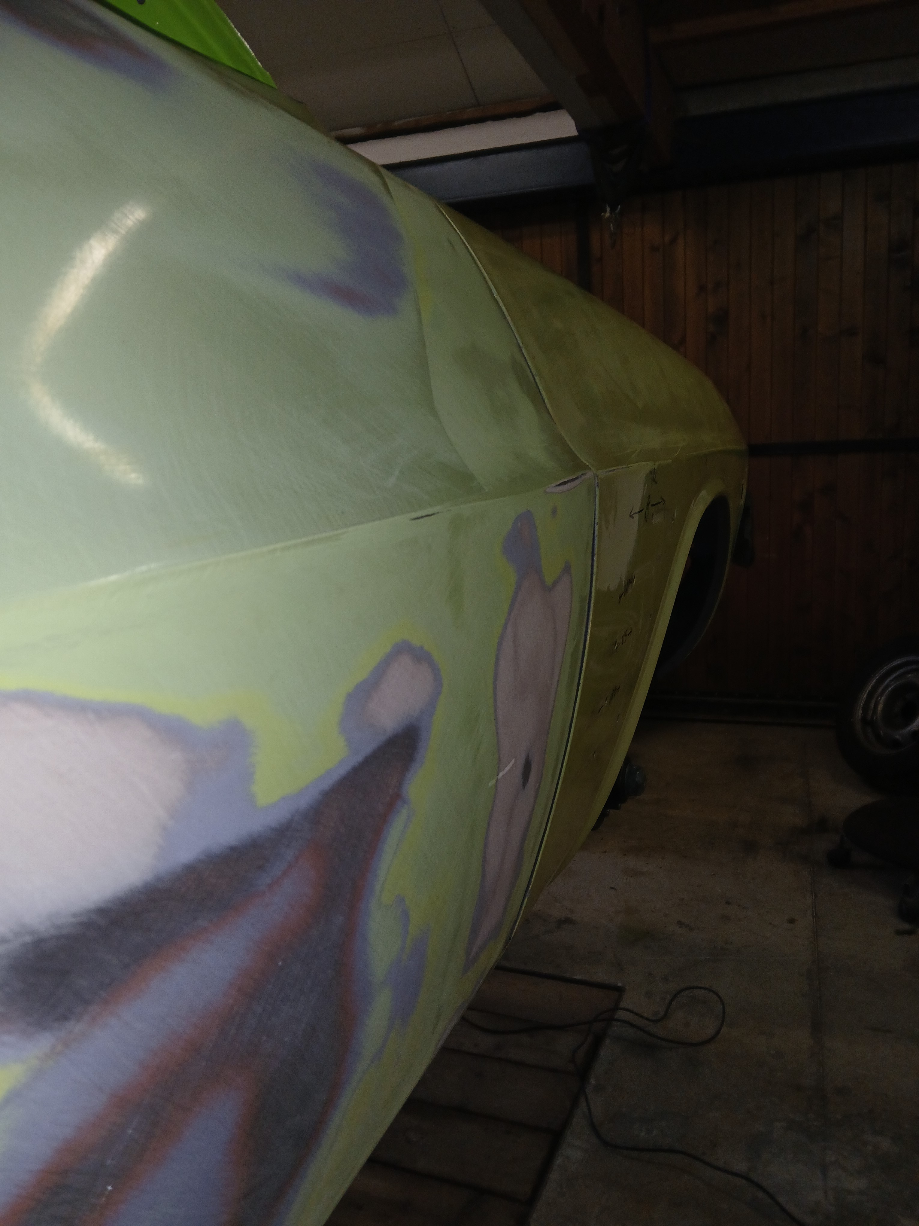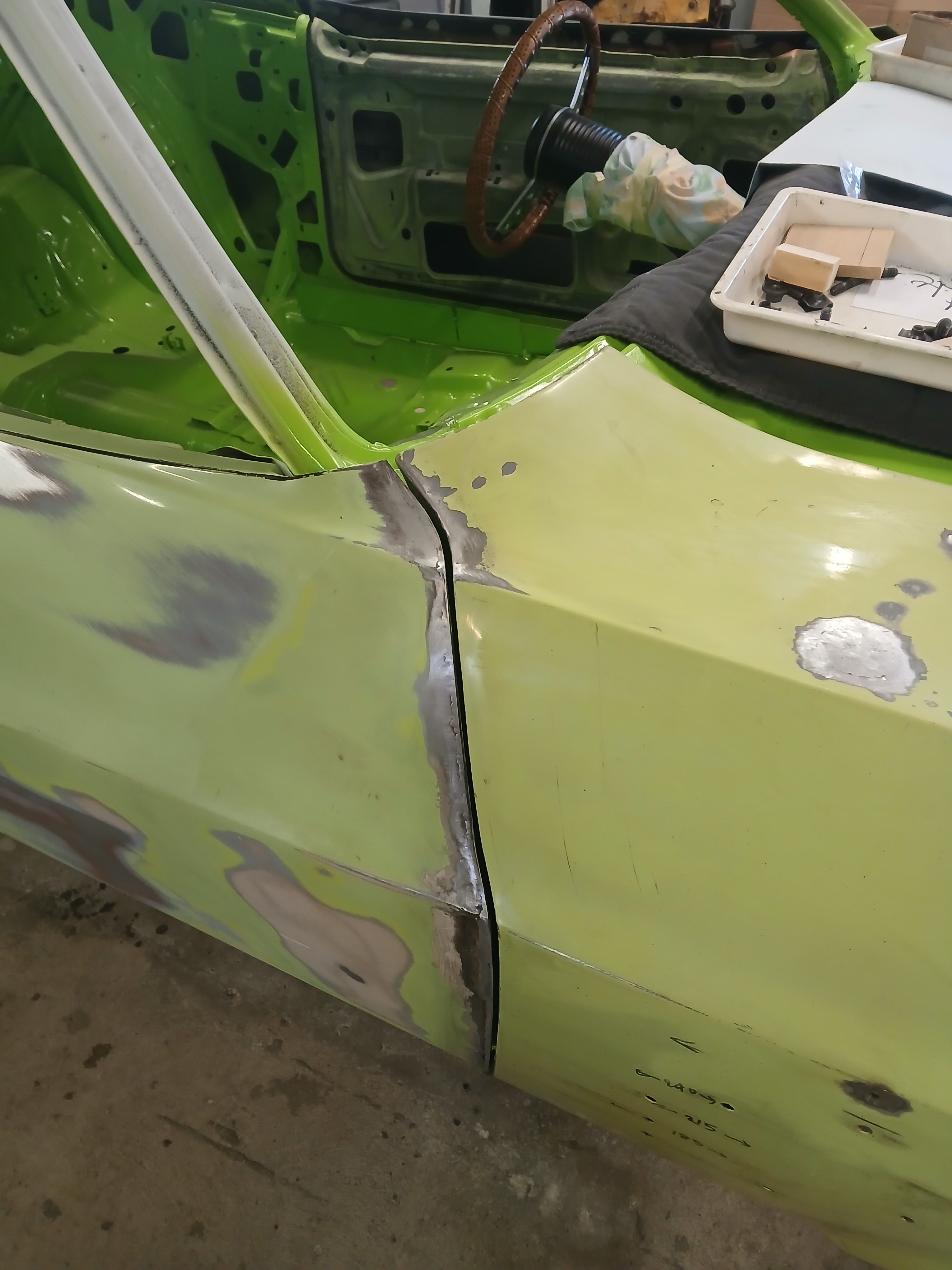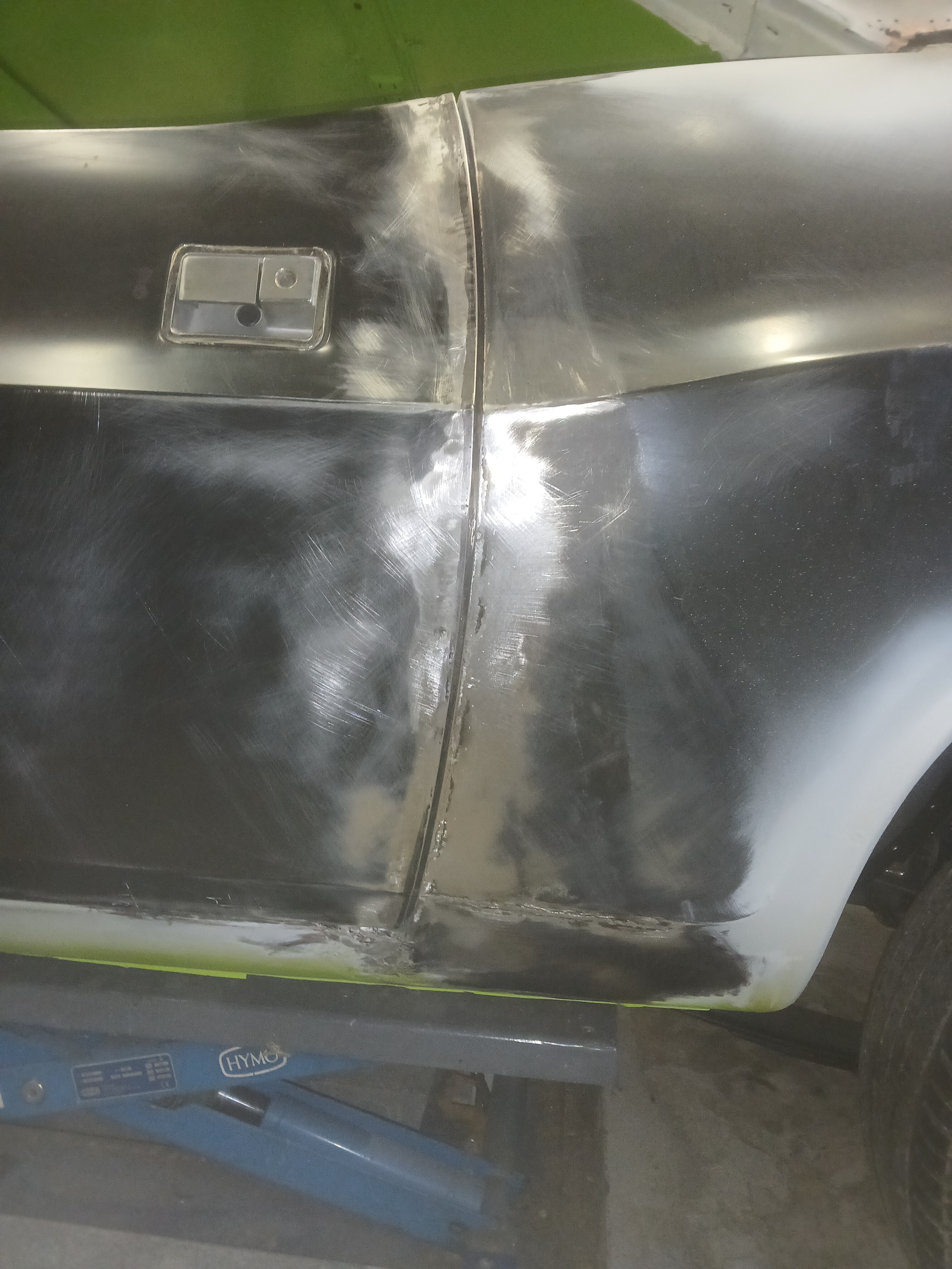 J'ai fini l'alignement des panneaux doté droit , rechargé un peu les arrêtes de portière pour égaliser les jours , et fait quelques patch par-çi par-là ... un vilain trou rempli de mastic