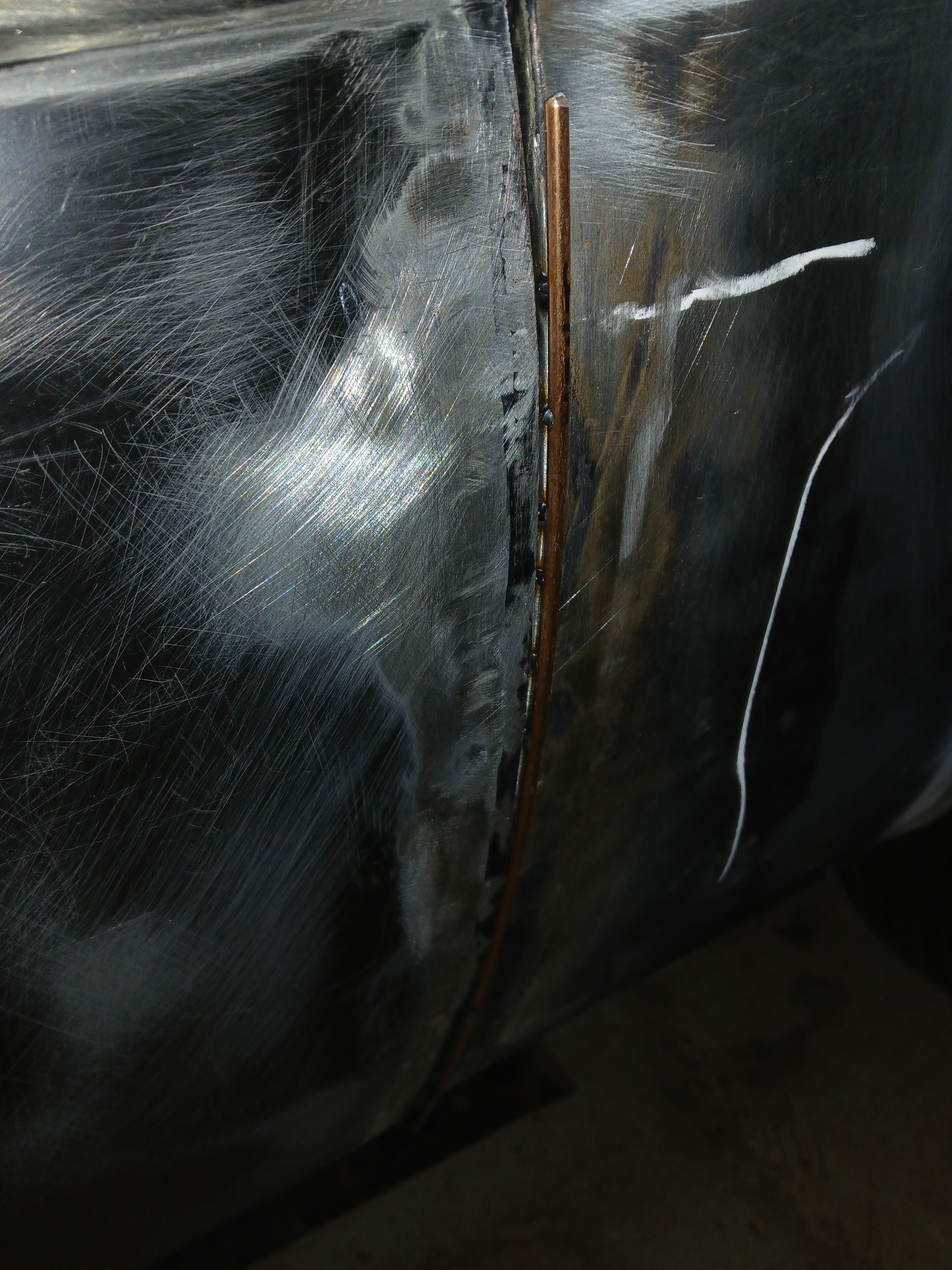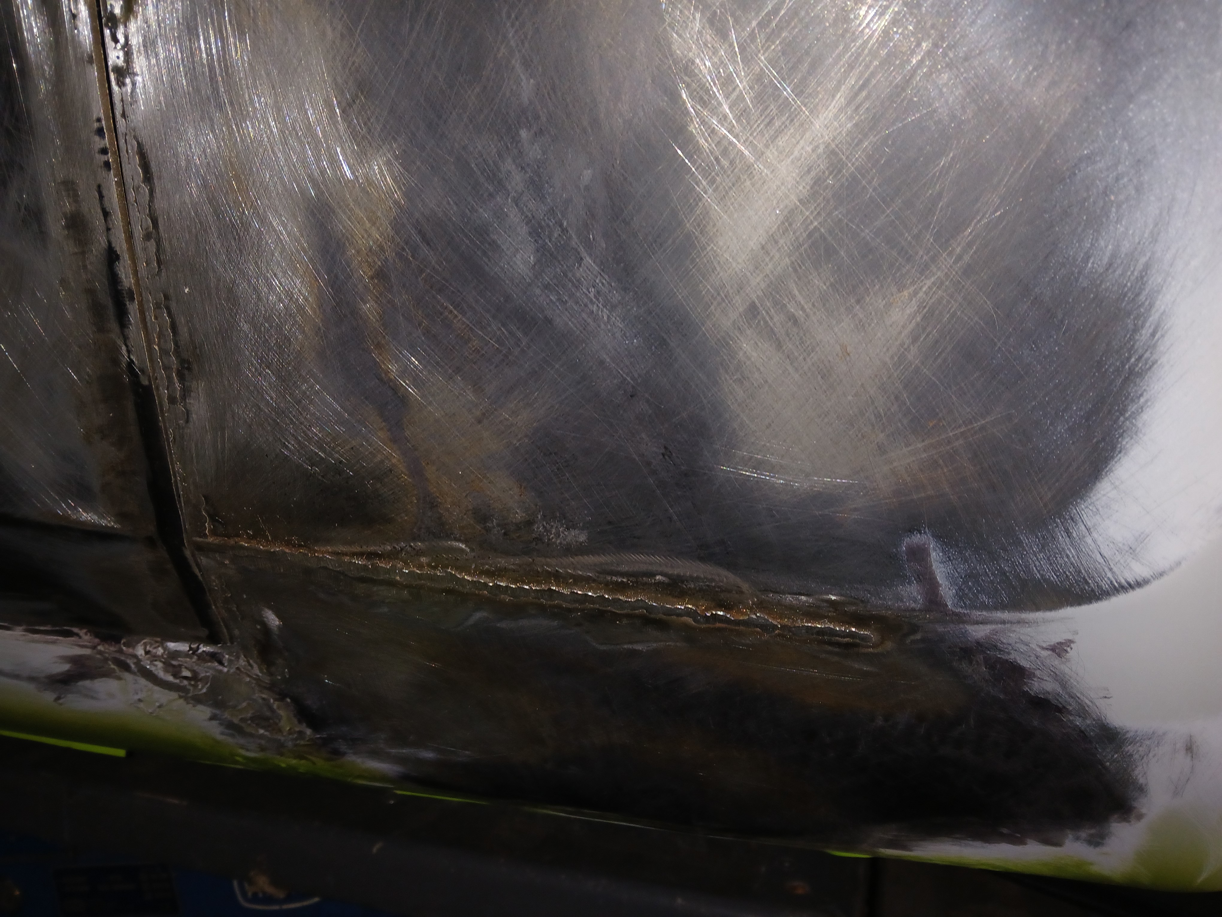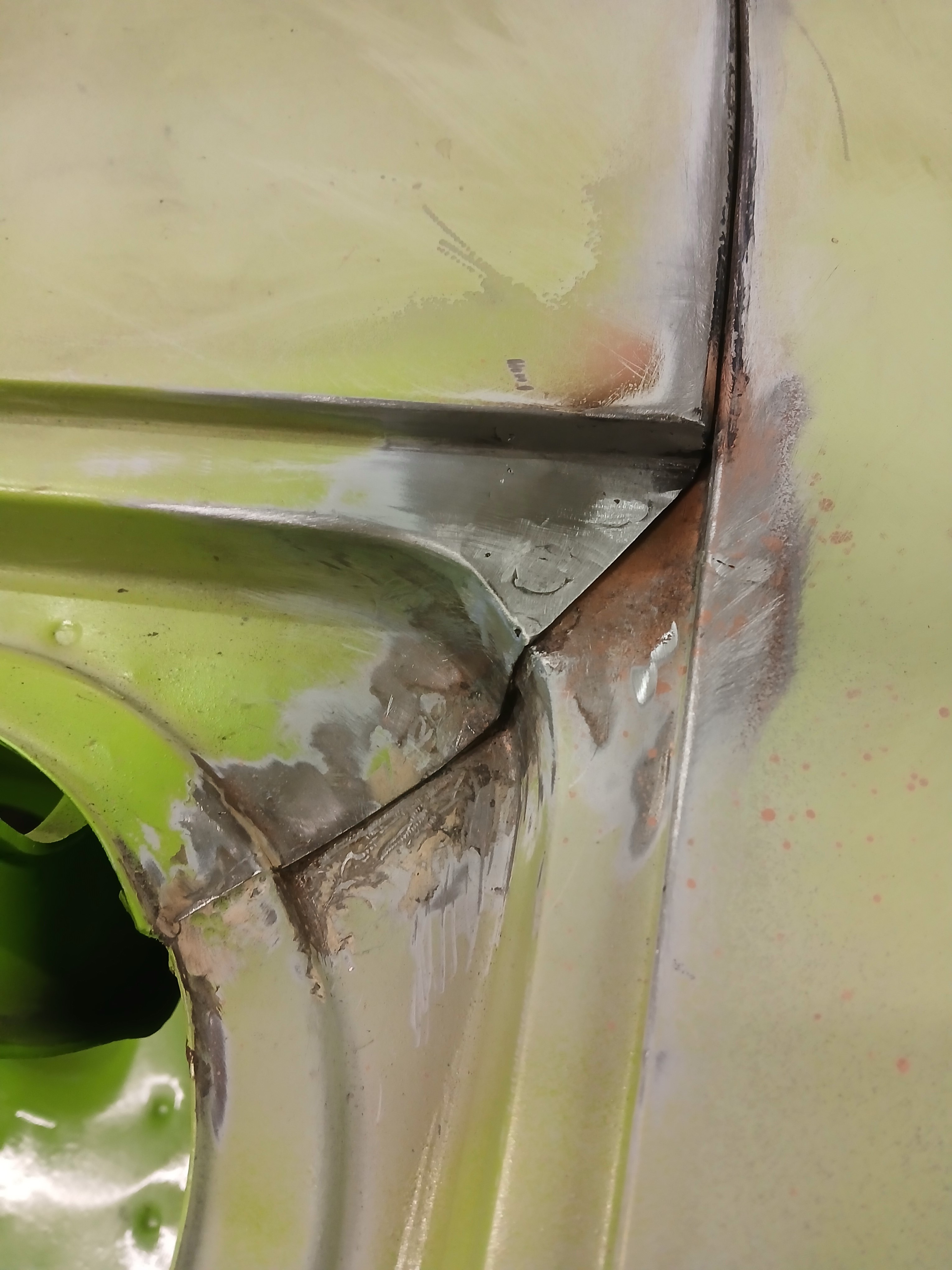 J'ai fini l'alignement des panneaux doté droit , rechargé un peu les arrêtes de portière pour égaliser les jours , et fait quelques patch par-çi par-là ... un vilain trou rempli de mastic