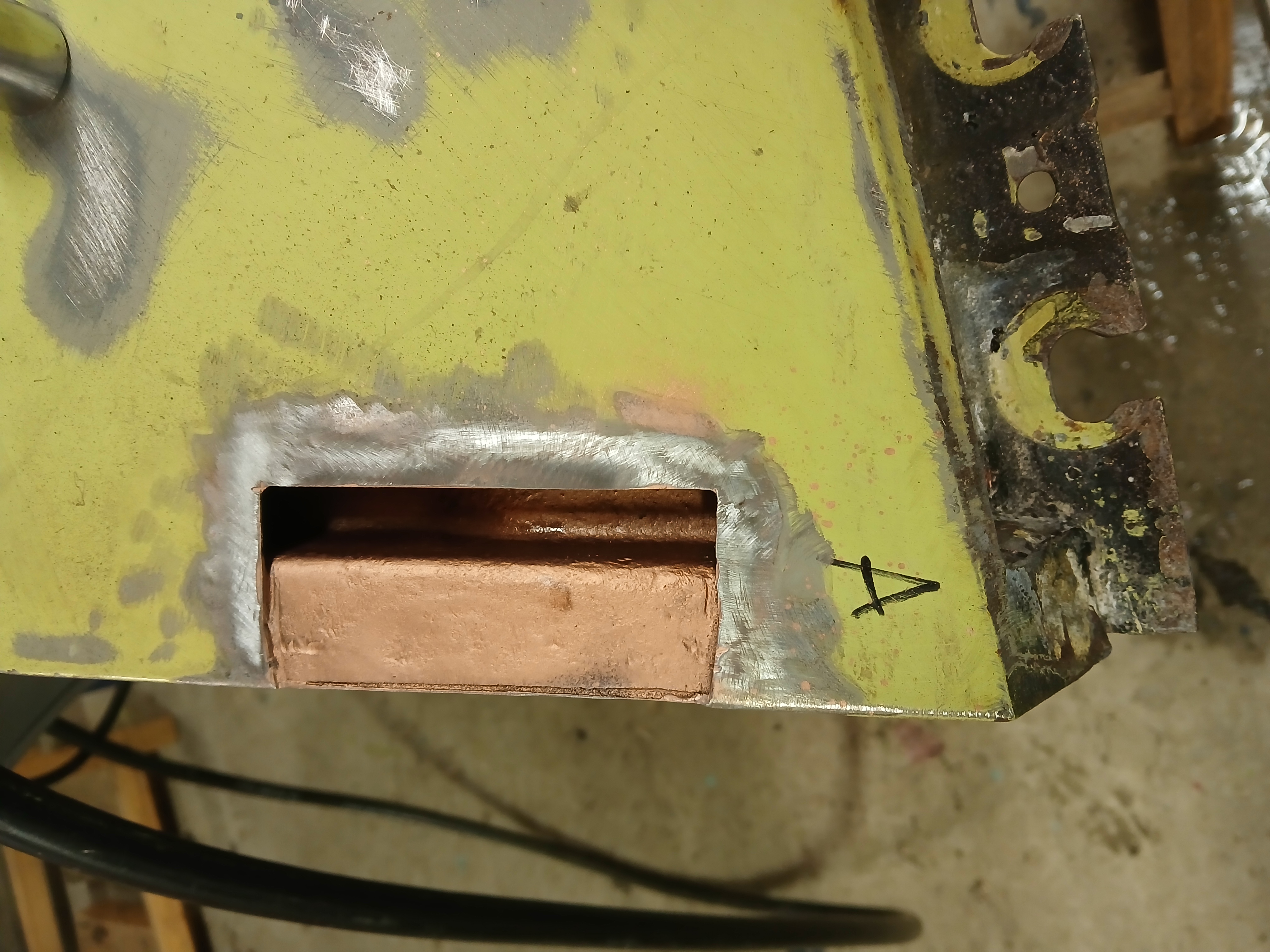 Soudure d'une baguette pour refaire l'arrête. Ajustement de la baguette au profil de la porte. Découpe et soudure du panneau sur la baguette. un coup de disqueuse pour effacer les soudures. pareil pour la partie basse. un dernier coup pour finir puis reglage du jour de la porte C'est pas super , mais je suis plutôt satisfait