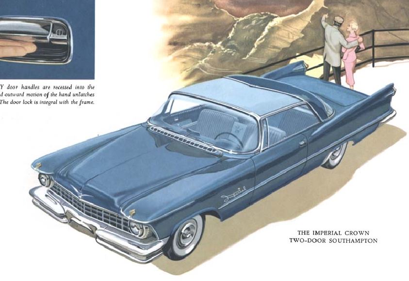On peut supposer des combinaisons de couleurs pour 57 et 58 similaires à 59, car je doute que la marque ait proposé des trucs trop osés, même si on pouvait commander un peu ce qu'on voulait (comme le cabriolet 58 Garnet Maroon métal avec intérieur vert, ou la LeBaron 58 belge christinisée par la suite qui avait un intérieur très particulier).