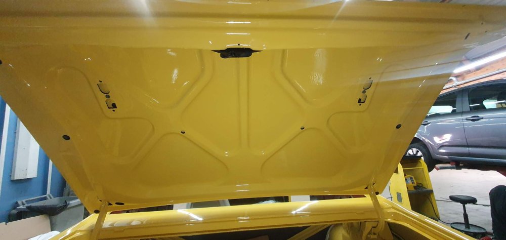 La tôle autour du radiateur était souvent rebarbouillée en noir mat après le passage en peinture pour éviter que l'on voit la couleur (jaune chez toi) au travers de la calandre lorsqu'elle sera remontée.