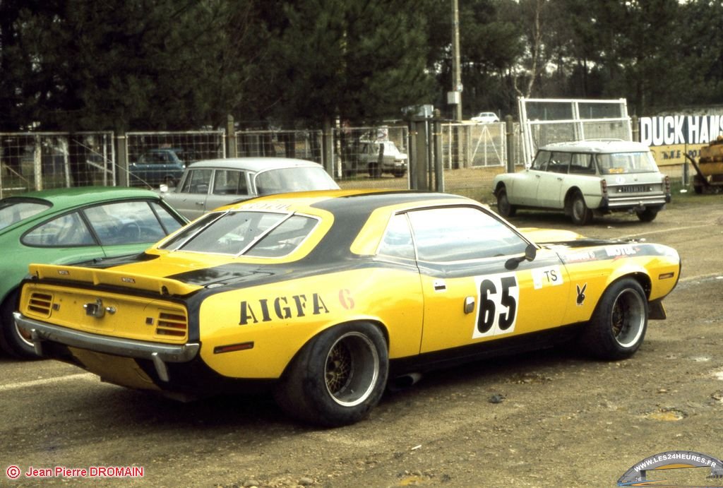 Pour Le Mans 75 le numéro de course #65 ce sont les 2 Heures, le numéro #89 ce sont les essais des 24 Heures, ici on reconnaît bien de dos J-C Géral, qui, après que Michel Guicherd ait explosé le 426 Hemi préparé après environ 10 tours le premier jour des essais, a eu à peine le temps de faire 3 tours avec son 426 Gr.1 donc de série, piston perçé également....c'est ce dernier moteur que l'on trouve actuellement sur un certain cabriolet Hemicuda 71 bv4 reconstruit, qui se trouve toujours au Canada, en attendant des jours meilleurs....