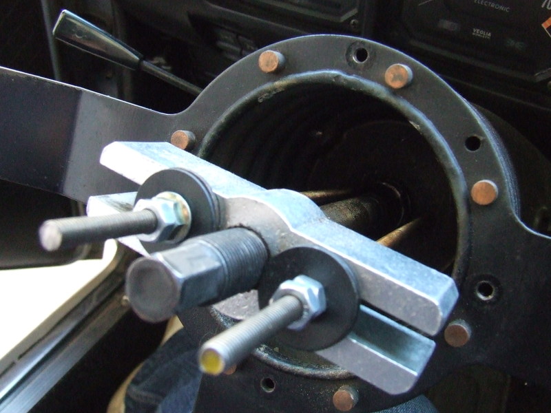 j'ai vu qu'il y a avait 3 trous sur le volant autour de la colonne, et 2 sont taraudé. j'ai foutu des vis dessus, fais levier dans tout les sens mais rien