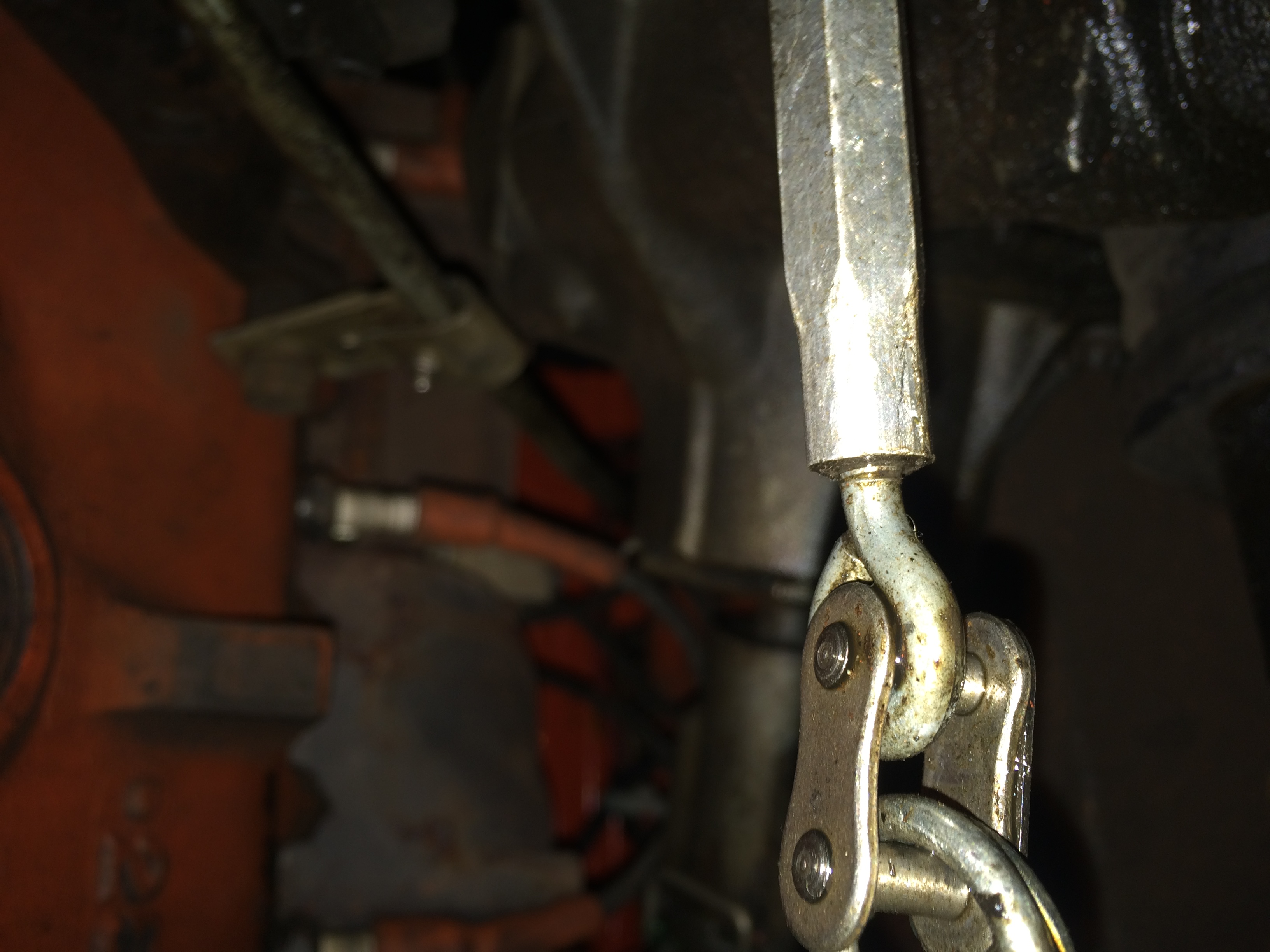 Le but de l'opération est d'intervertir les places du ressort et du tendeur en raccourcissant le ressort et en augmentant la taille du tendeur. Cela permettra de virer un écrous de chaîne et un maillon qui n'ont rien à faire là et de laisser à coté du pot d’échappement un tendeur qui ne crains pas la dilatation contrairement au ressort.