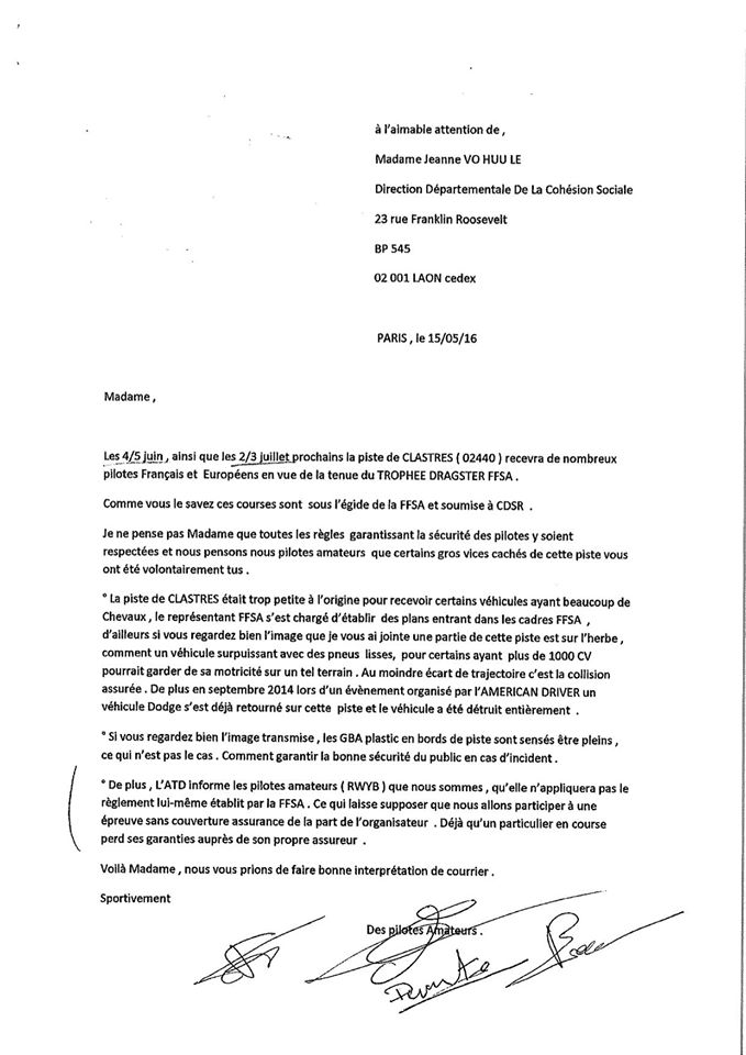 Quelques semaine avant cet événement un courrier « anonyme » ( pas si anonyme que ça à la vue du logo laissé dans la publication) a été envoyé à la cohésion social qui l’a fait remonter à la préfecture puis à la fédération FFSA.