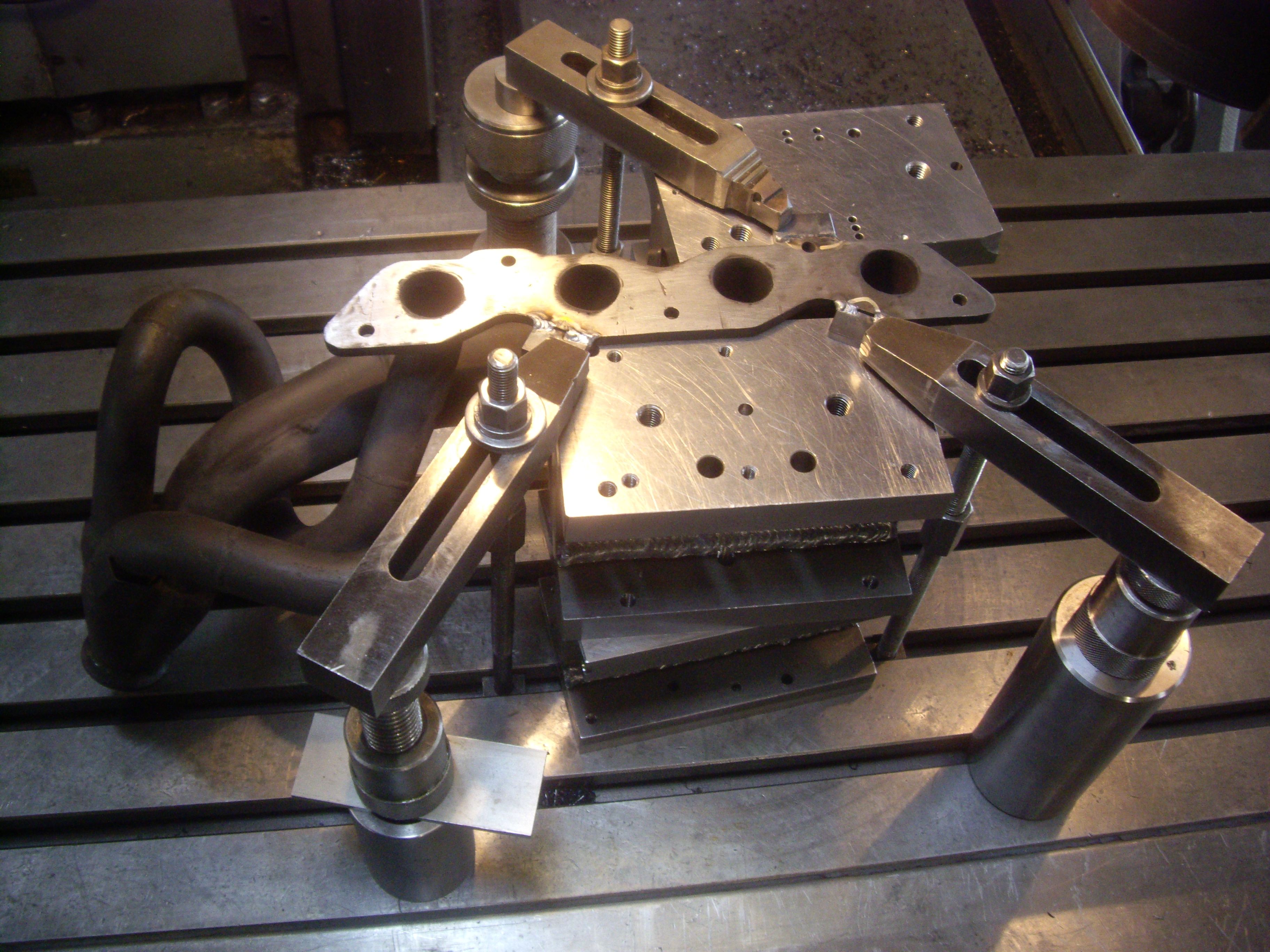 Un collecteur tordu à surfacer.... Je soude les taquets pour pouvoir serrer la pièce, je les supprime quant j'ai fini.