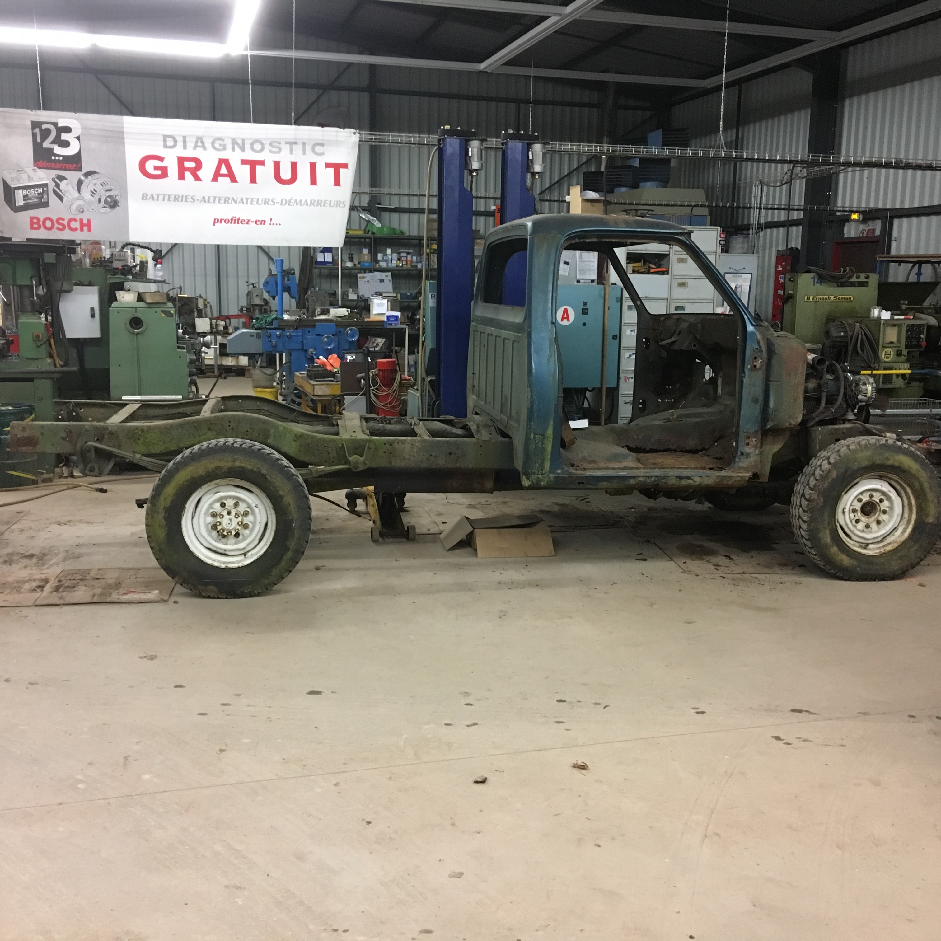 Depose cabine, faisceau electrique chassis/moteur, arbre de trans avant et arriere, amortisseurs arriere, reservoir, echappement.