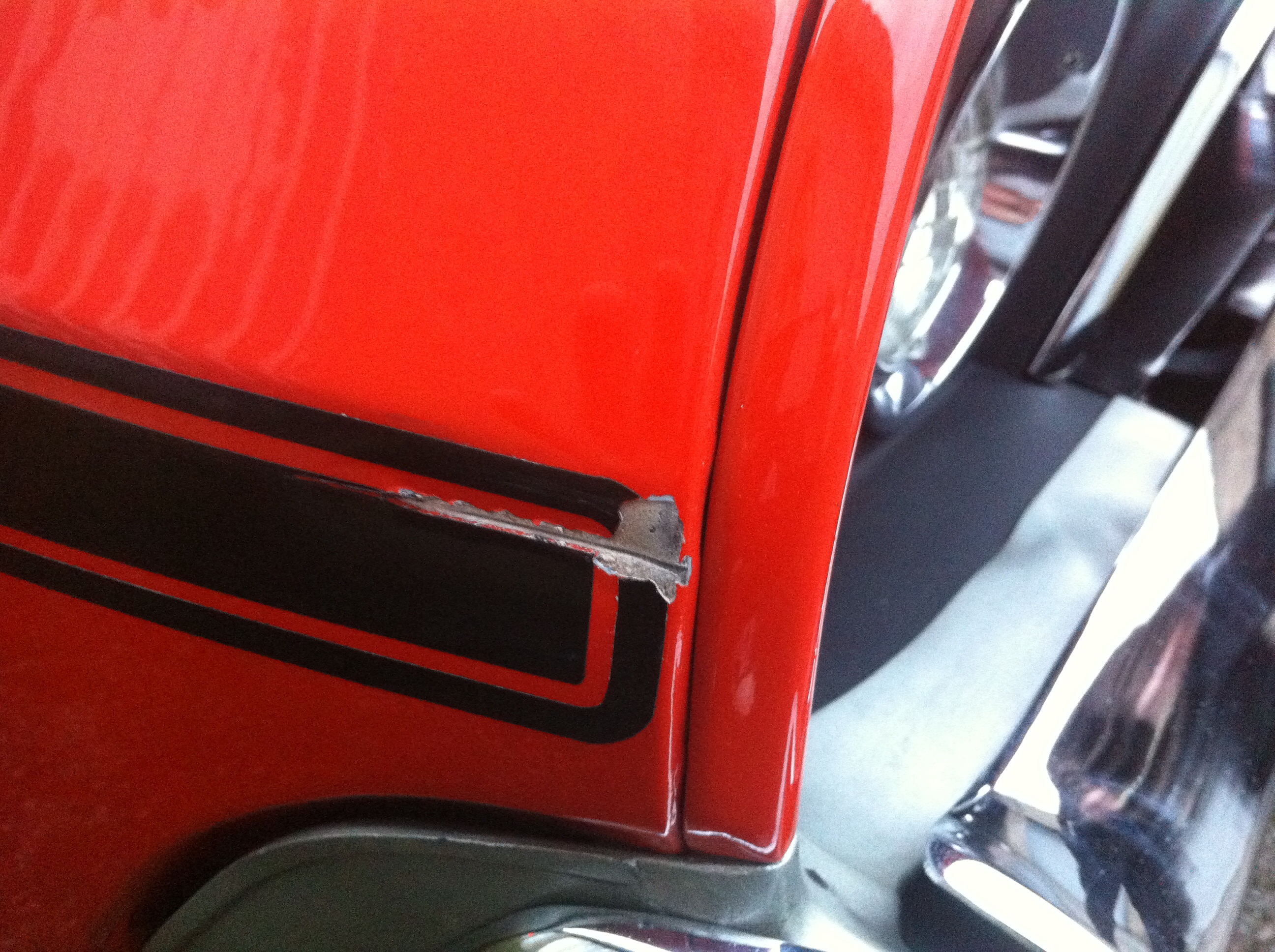 Ouais c'est pas de bol , je vais essayer de trouver un bon carrossier pour refaire sa... Y'a pas grand chose , un peu de ponçage , de mastic pour lisser le tout et un voile de peinture et sa devrait être comme neuf. Le plus chiant sera le vinyle a faire reposer sur toute l'aile...