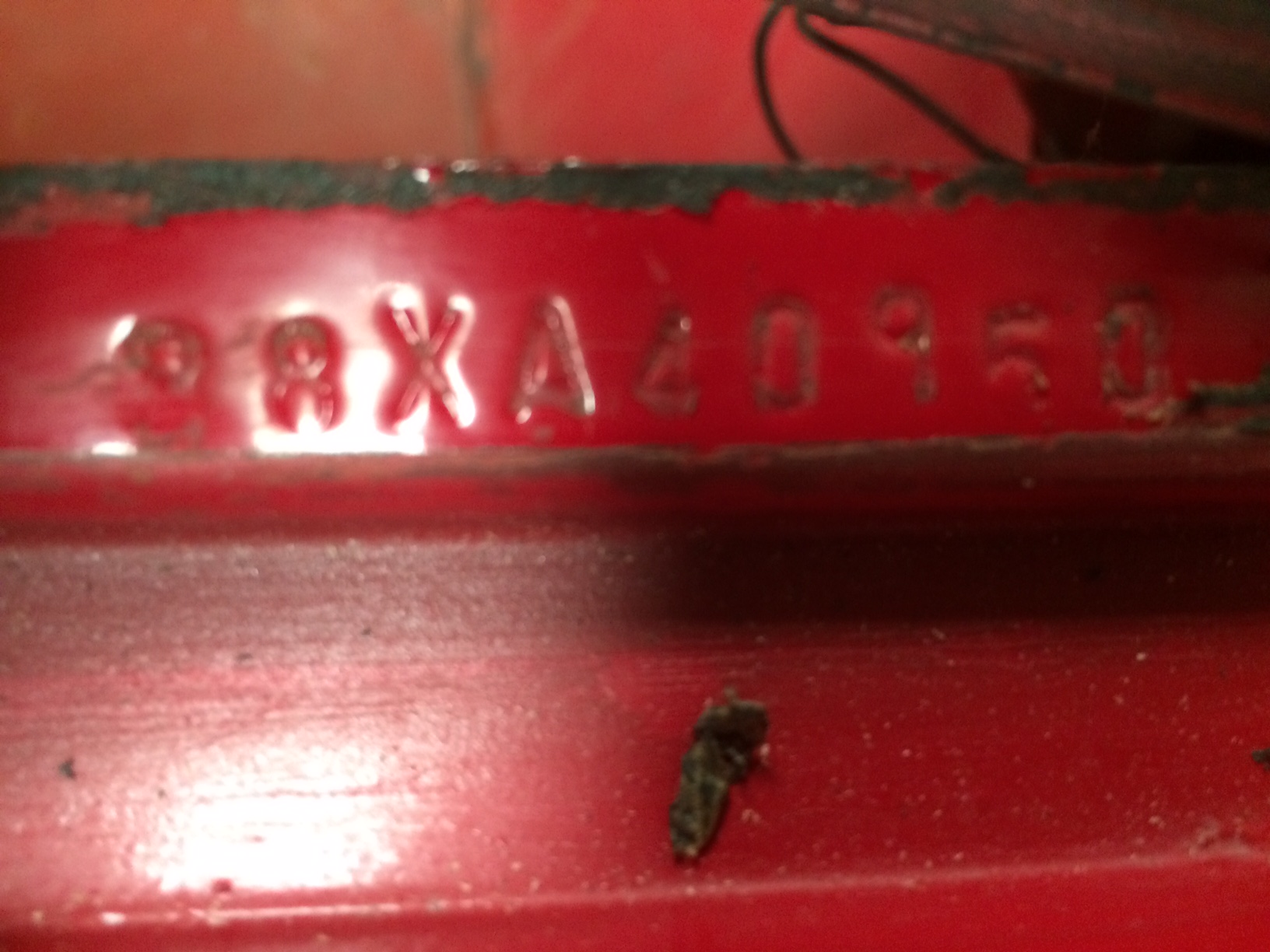 Ensuite j'ai vérifié que le support de radiateur ainsi que la gouttière du coffre soit bien frappé avec la série de lettres/chiffres qui correspond au (vehicle order) que l'on retrouve sur la fender tag...et ça match, c'est kool! ça prouve qu'elle n'a pas taper déjà :dance: