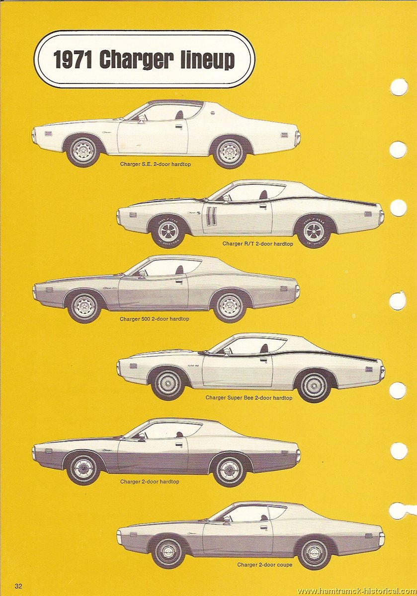 La SuperBee: avec l'abandon du coupé Coronet, c'est la Charger 1971 qui hérite de l'appellation SuperBee. C'est la sportive "à pas cher" avec peu d'équipements et gros moulins (383, 440-6pack et 426).