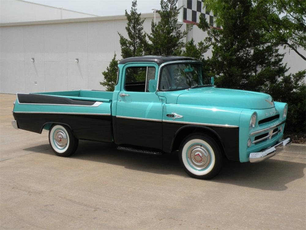 Dans le milieu des années 50, le groupe Chrysler accuse un léger retard face à la concurrence au niveau des utilitaires, GM a redessiné sa gamme avec succès avec sa "Task Force" et Ford a également repensé sa cabine en l'élargissant, pare brise panoramique etc. Et surtout en 55 Chevrolet sort le Caméo, un nouveau "concept" de pick up un peu plus luxueux avec une benne plus large, dotée d'aile en poly et d'une peinture 2 tons. Ford pour leur part partent sur le concept du Ranchero. Dodge réagira en 57 avec le modèle que vous avez sous les yeux. histoire de réduire les coûts, ils prélèvent les ailes arrières du break Dodge 2 portes ainsi que le pare choc et les adaptent sur la benne et le hayon élargis.