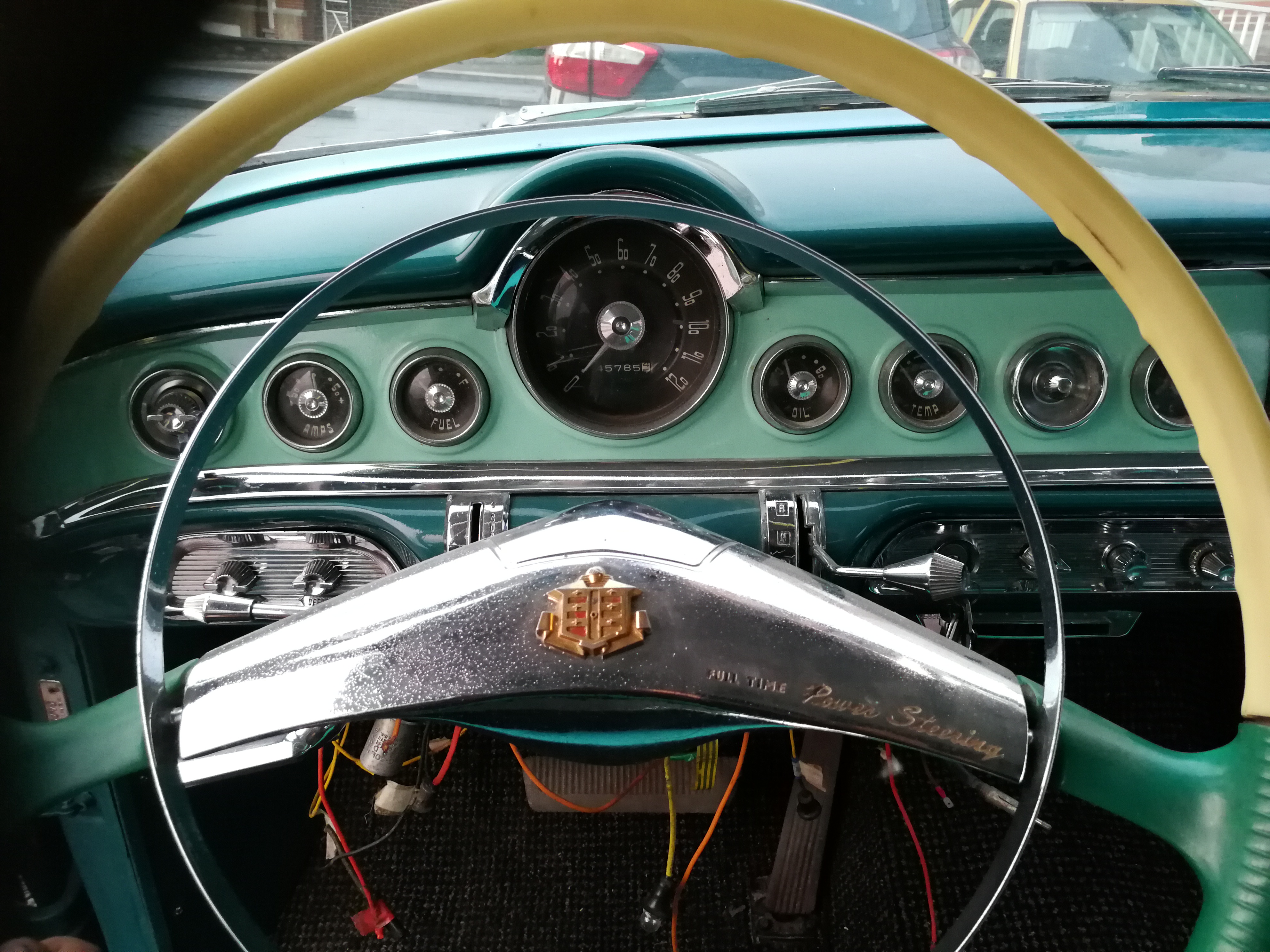 C'est donc une dodge custom royal de 1955 avec le 270ci (4.4L) V8 hemi super red ram de 193cv, la peinture a été faite il y a 3 ans, l'intérieur pareil, frein complet et échappement complet neuf, il reste à finir le ciel de toit, le pare choc arrière à chrômer et le plus délicat le faisceaux électrique