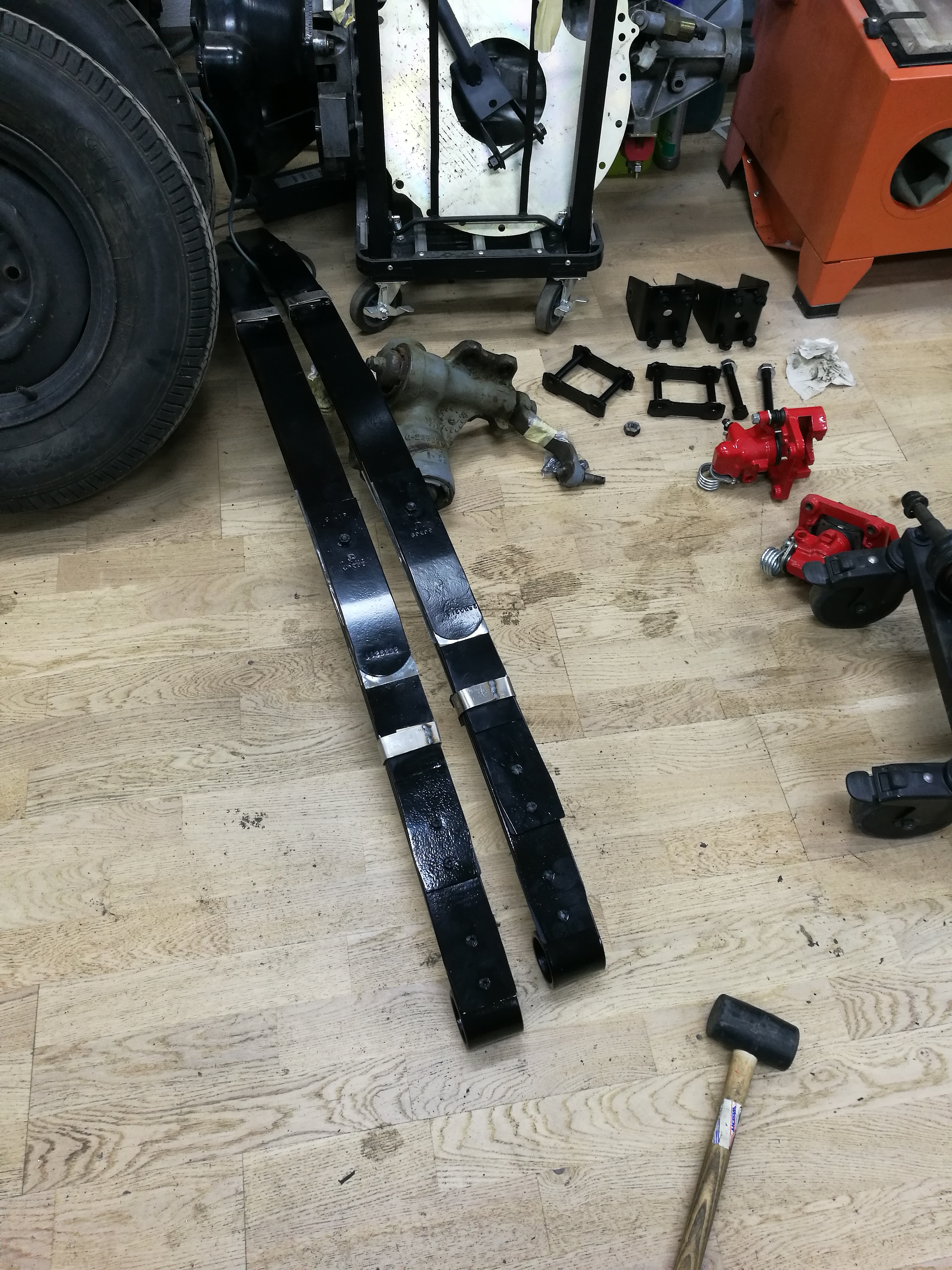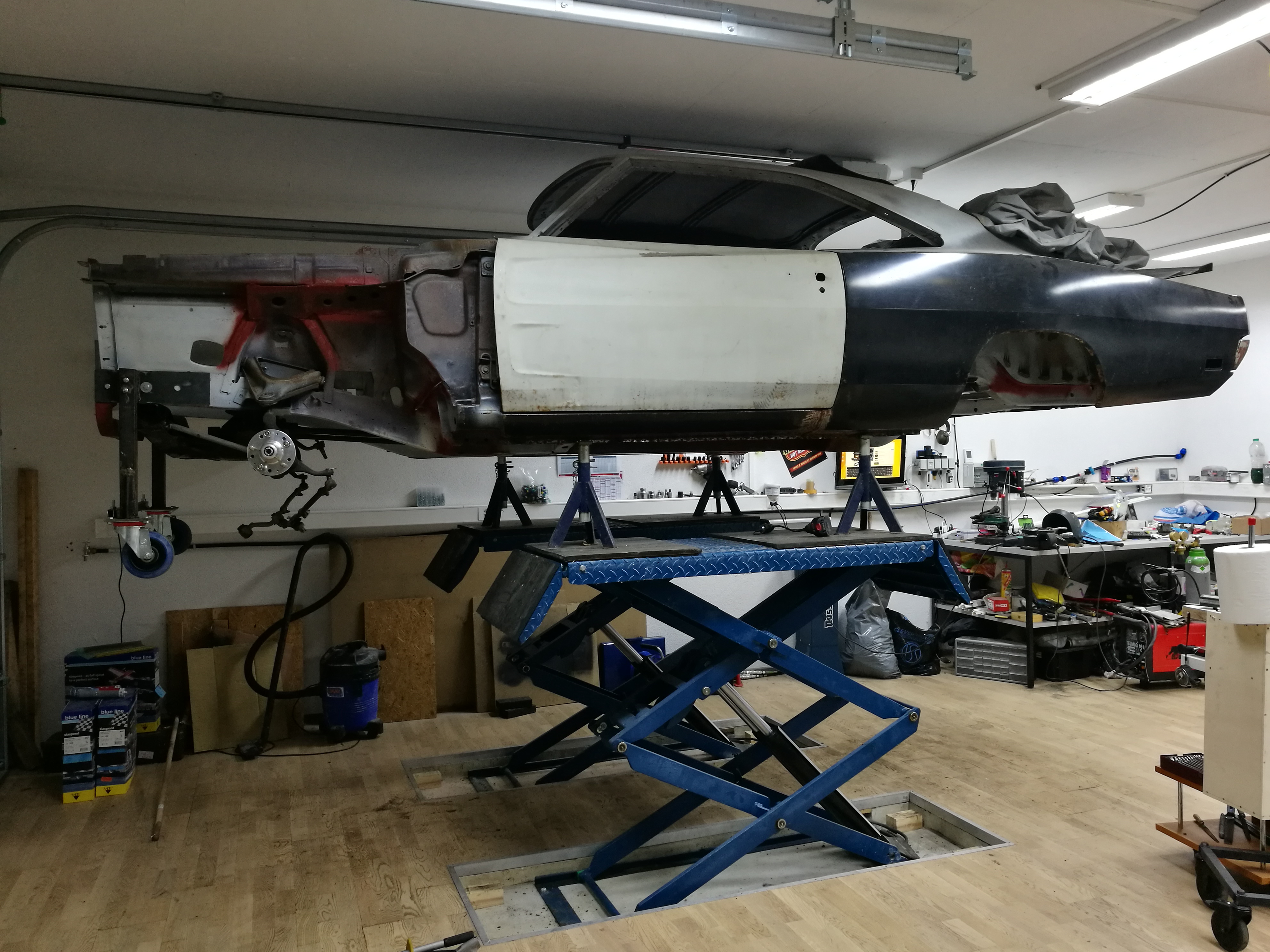 Pour le nouveau garage je voulais un sol qui soit résistant à l'abrasion, aux pièces chaudes, joli, pas trop cher, mais surtout isolant thermique. Après avoir envisagé toutes les solutions j'en suis arrivé au bois.... Du coup j'ai mis de l'isolation carrossable et du parquet massif. Ca supporte allègrement la pression des pneus. On verra pour la grue avec un v8 + boîte... Et puis avec le lift ciseau je ne devrais plus tellement bosser par terre.