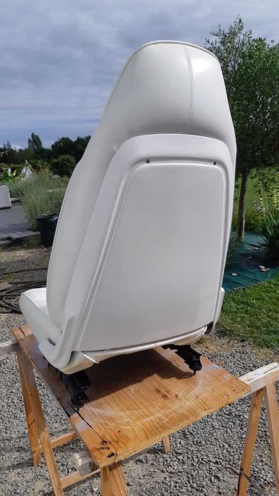 Pour commencer, finition des sièges avant: lavage et ponçage des coques des dossiers et mise en apprêt, puis peinture Ensuite remontage du siège terminé, ça a quand même meilleure tête qu'au début