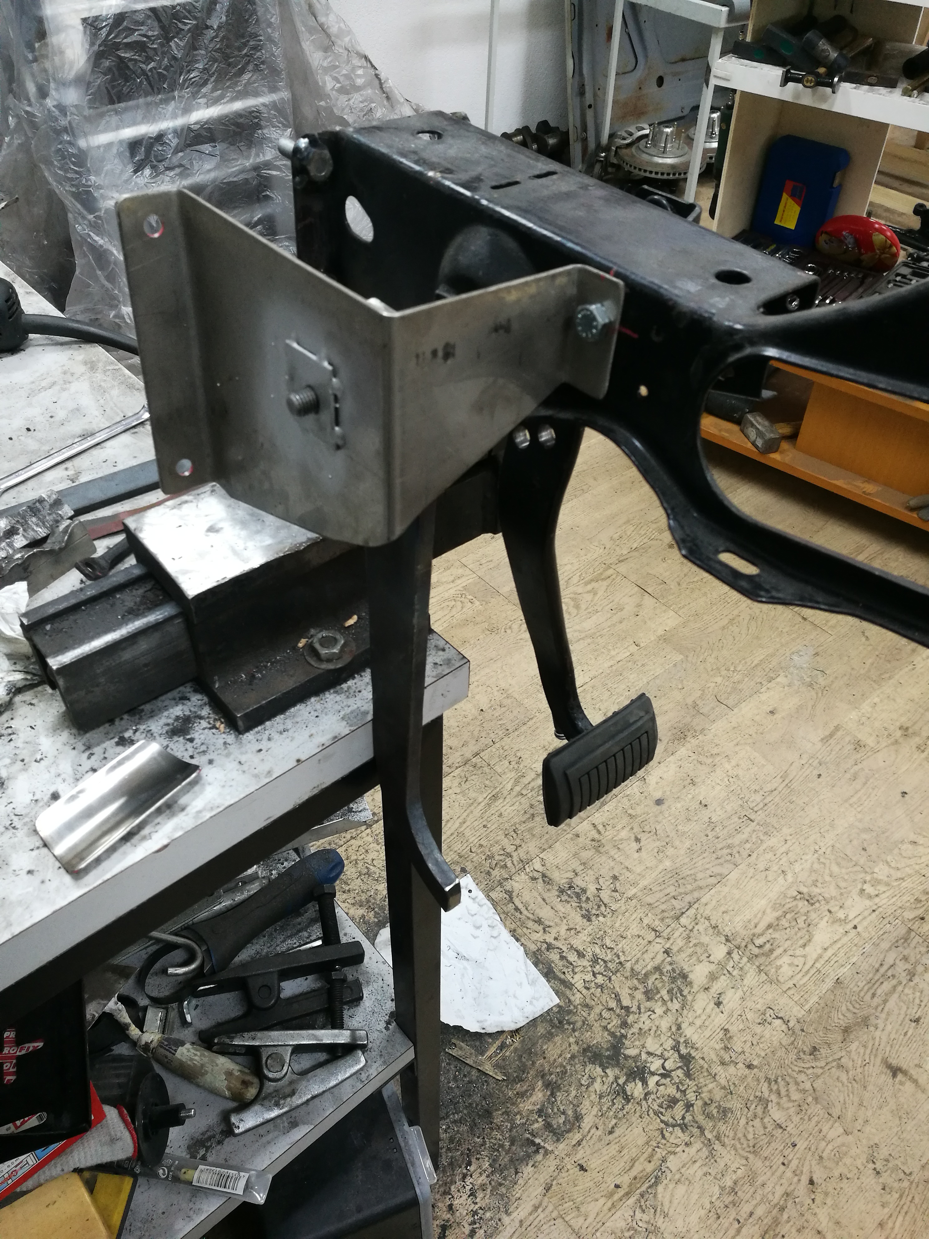 Montage du nouveau réservoir, confection d'un ensemble de pédalier pour boîte manuelle. Là aussi il existe un kit tout fait, mais j'ai préféré faire moi-même. J'ai forgé la pédale parce que... Bah... J'aime bien forger....
