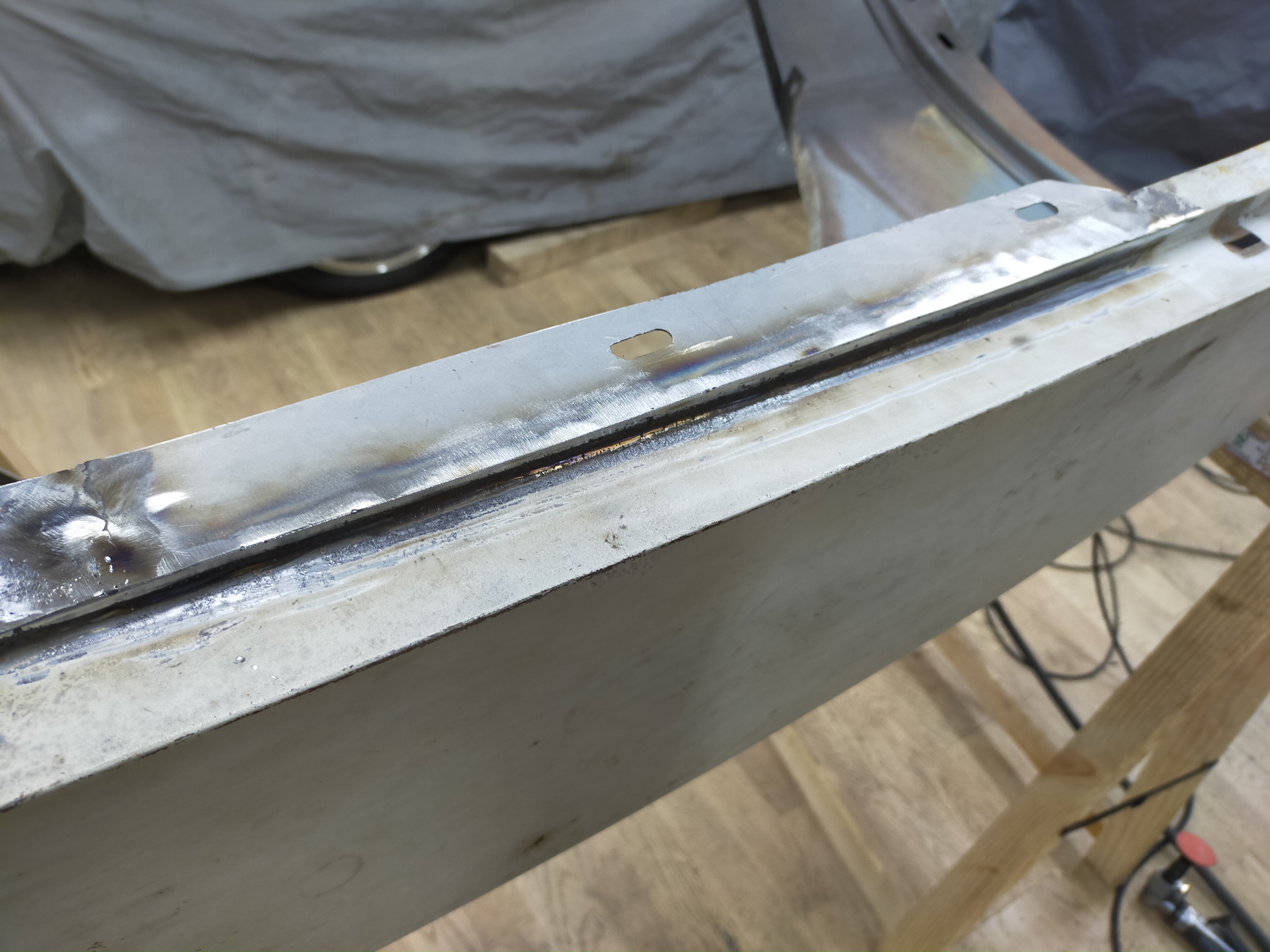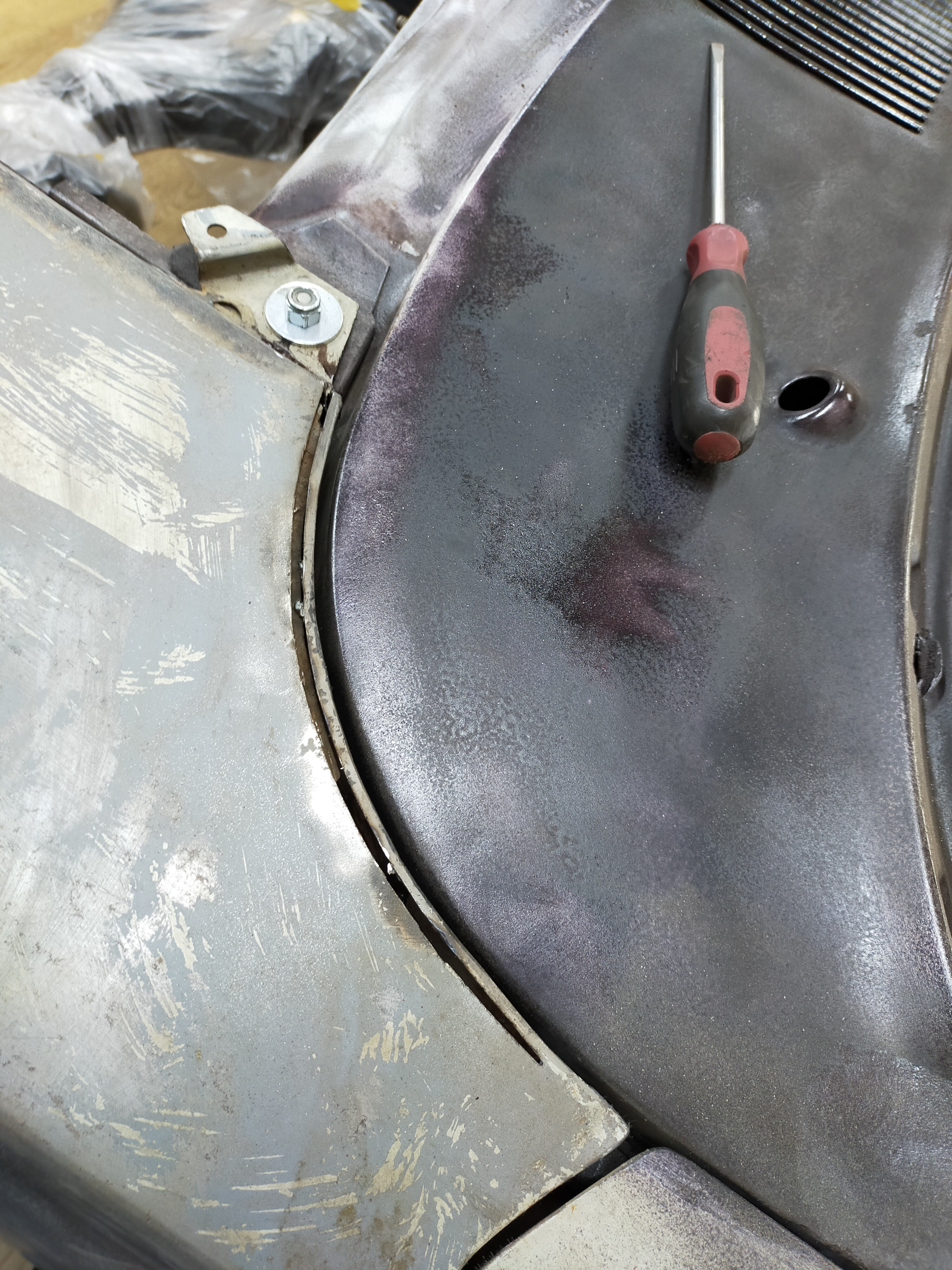 Je galère un peu car c'est la première fois que j'attaque un vaste chantier de carrosserie. Mais comme d'habitude j'aime bien faire moi-même, même si ce n'est pas parfait. A noter pour rigoler le le bas de caisse était un chouia trop en avant. J'ai donc tout coupé puis replacé en arrière... Mais je l'ai remis trop en arrière maintenant.... Faut que je le recoupe.