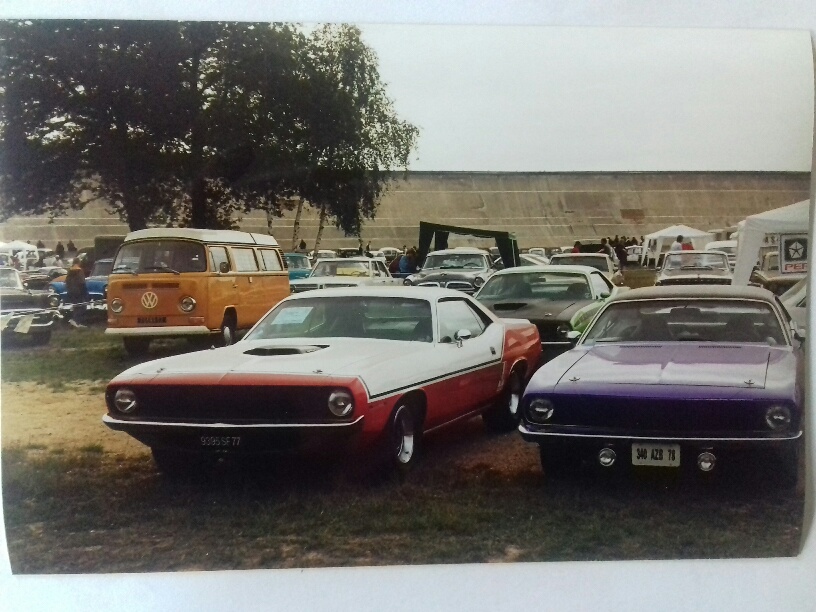 Voilà j'ai retrouvé 2 photos de to ancienne auto à Montlhéry en juin 1999, en bonne compagnie, avec l'Hemi de la famille Sarrazin à l'époque maintenant à Jean Debaude, et ma 'Cuda AAR e retour ou presque du Tour Auto.