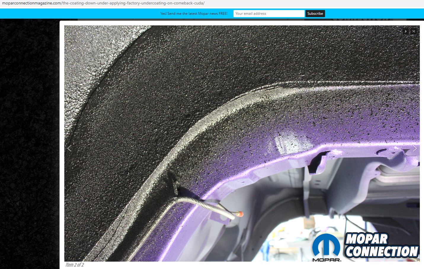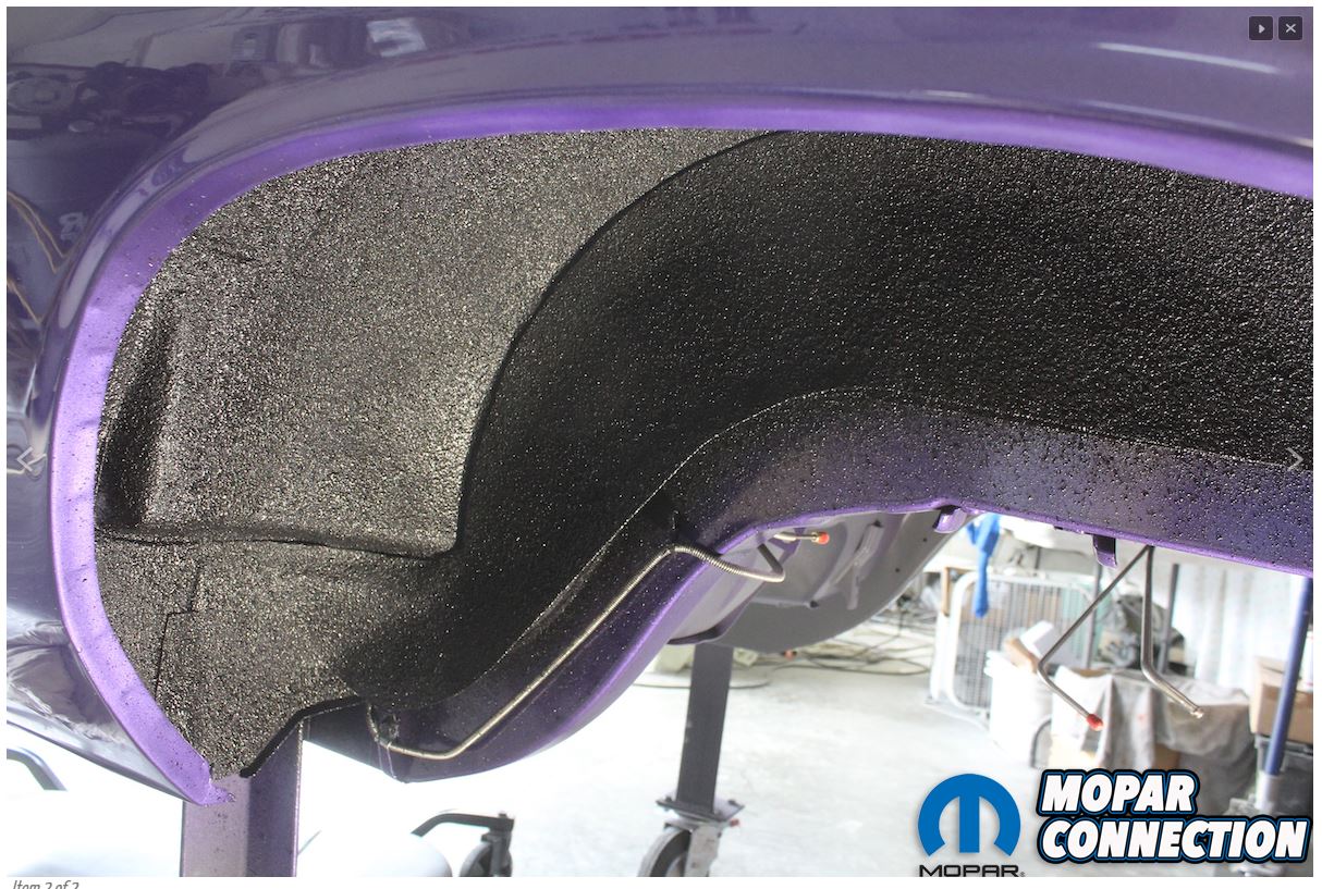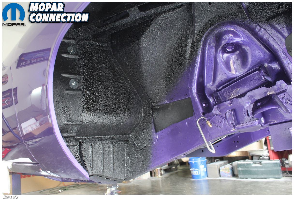 Voilà ce que ça donne sur une Hemi 'cuda '70: on devine à l'arrière plan la sous-face du plancher qui reste en apprêt gris clair, les longerons du 1/2 chassis qui ont été peint en violet FC7 en même temps que la carrosserie et l'intérieur des passages de roues puis l'anti-gravillon appliqué à l'arrache sur tout ça.
