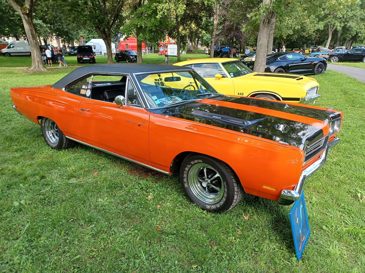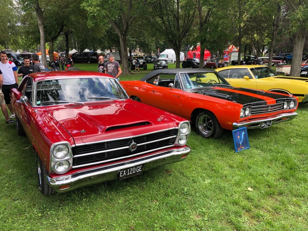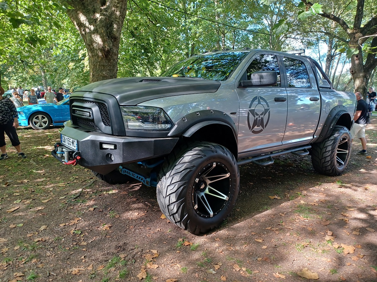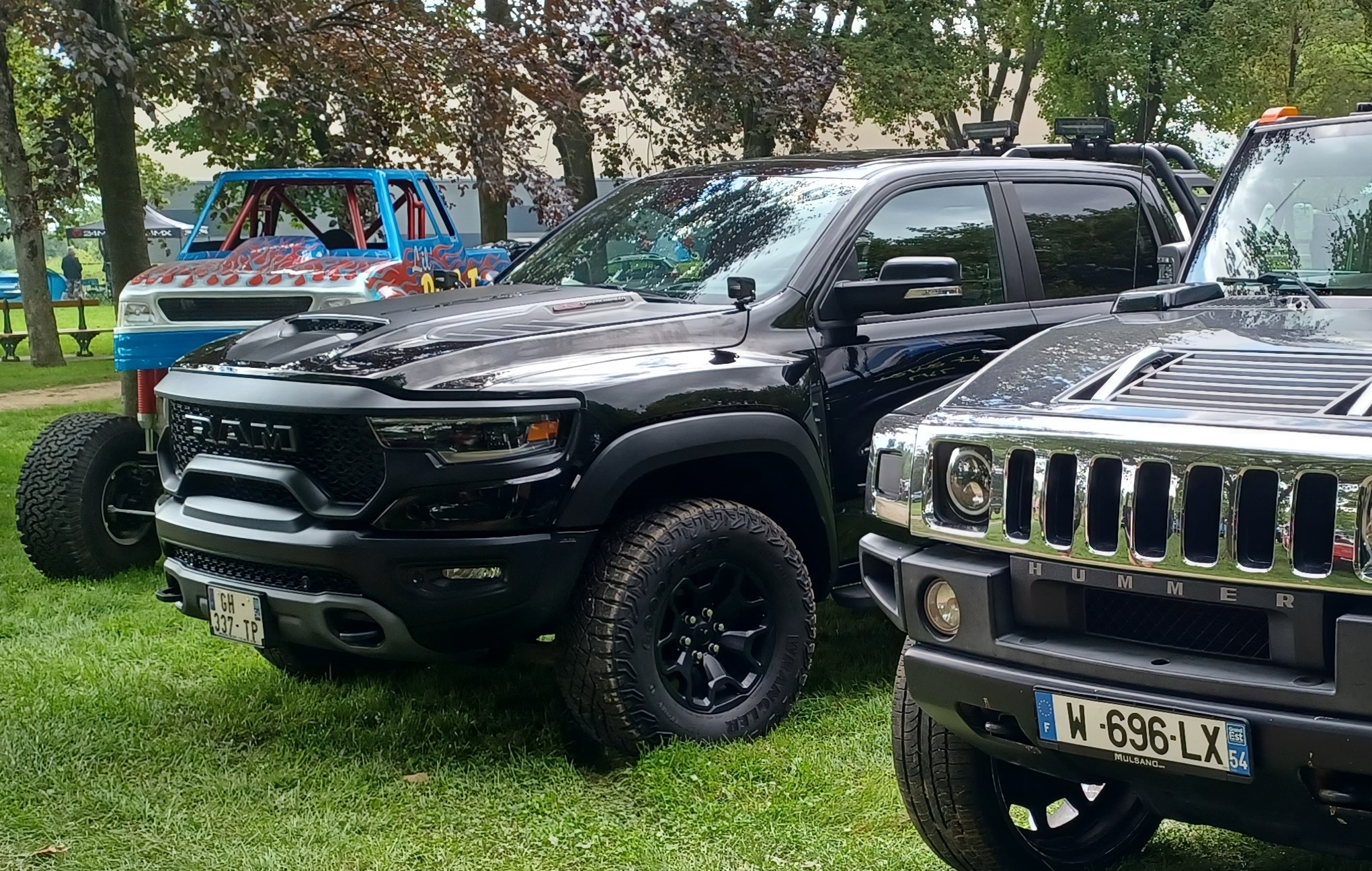 Roadrunner 383 RAM TRX avec plus de 600 bourriquots Ma fille avec la Charger R/T '71. Elle a eu droit sur la route et pendant le rasso aux habituels "T'as vu c'est une gonzesse au volant" Mon Imperial '58 2 autres Charger 3ème gen. Un RAM (2500? 3500? il a réussi à avoir une immat normale) rehaussé juste monstrueux. J'veux même pas savoir le prix des jantes et des pneus!