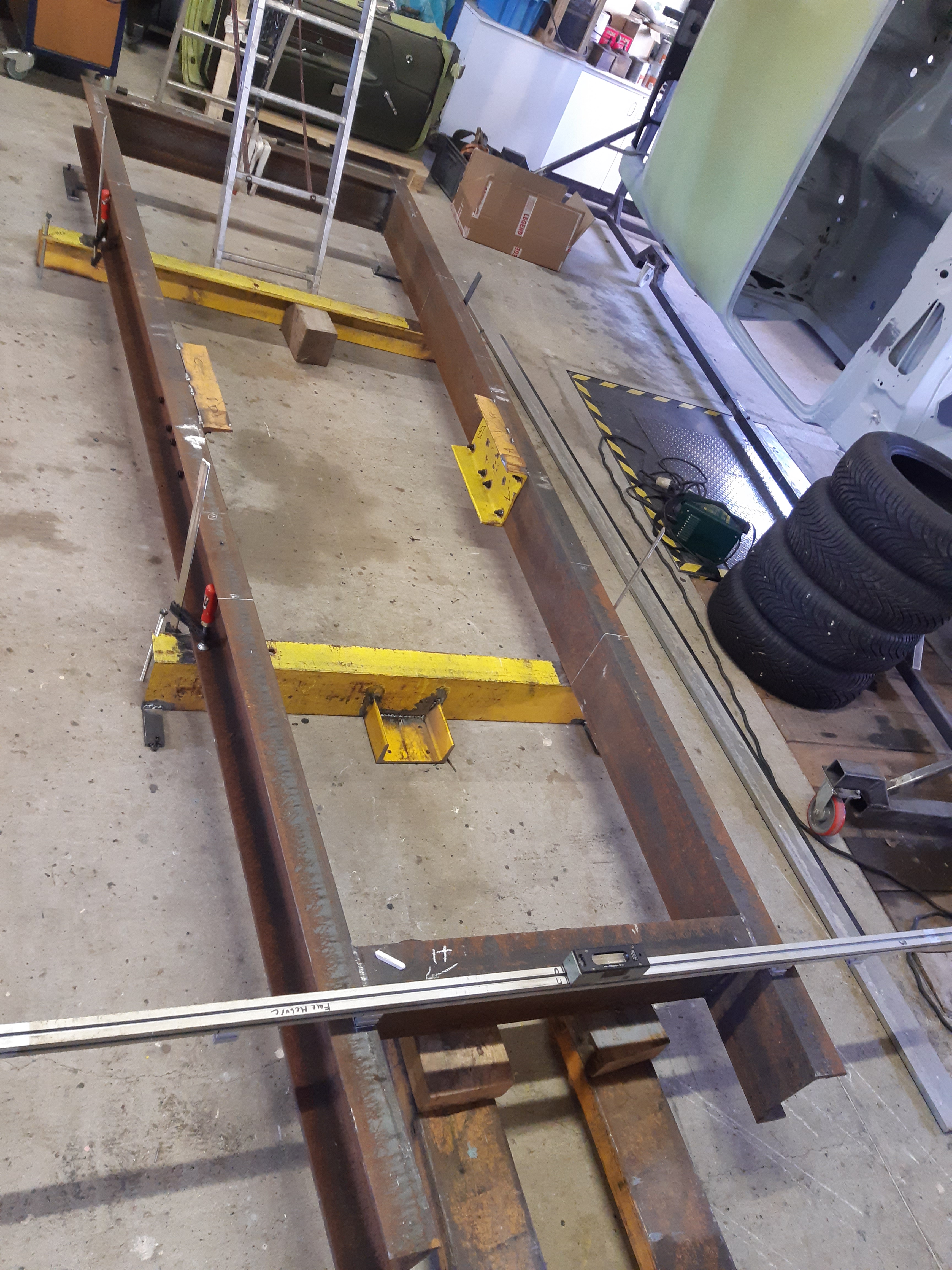 Avant d'attaquer la carrosserie, je ma suis dit que ce serait , peut-être , une bonne idée de la poser sur une sorte de "marbre" pour éviter qu'elle ne se tortille ,le but étant de changer les parties pourries, j'avais la feraille en stock donc GO !