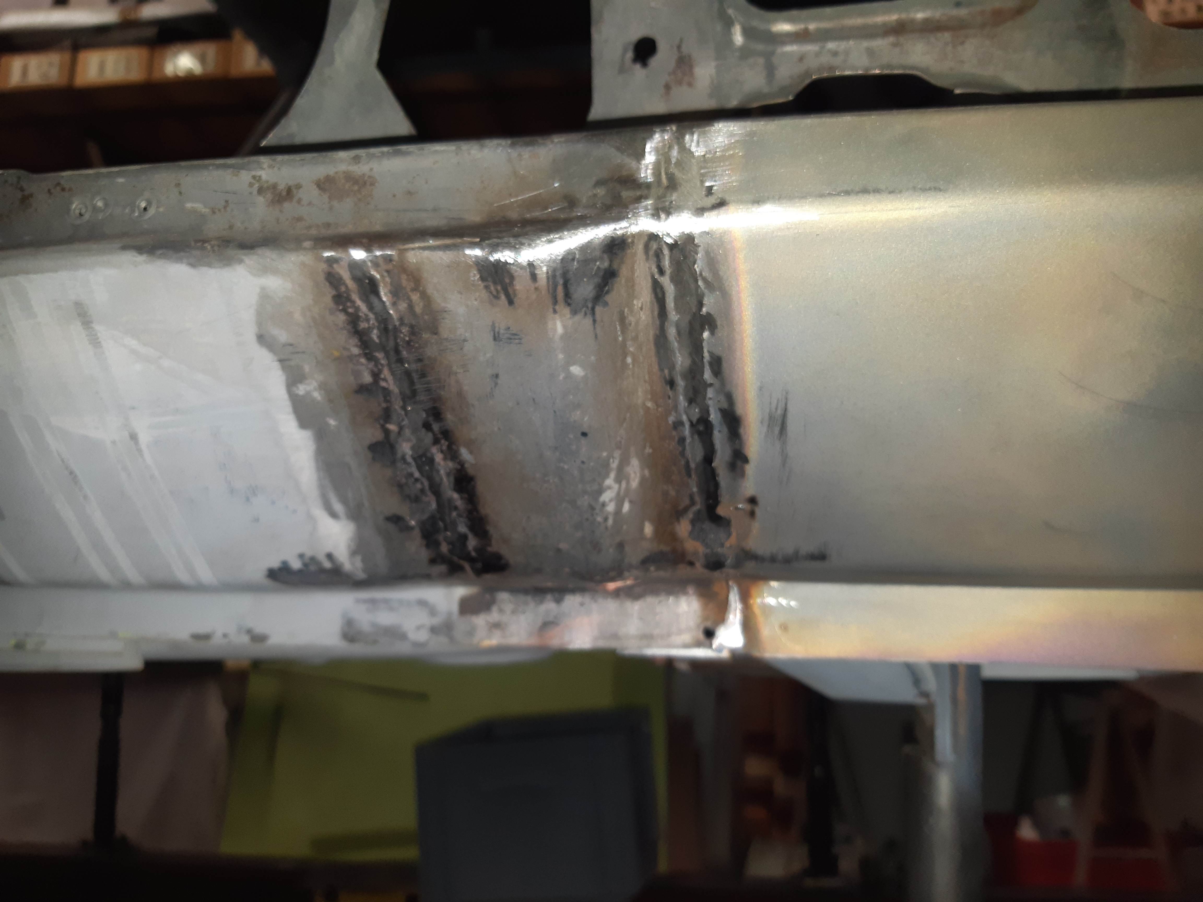 Avant d'attaquer la carrosserie, je ma suis dit que ce serait , peut-être , une bonne idée de la poser sur une sorte de "marbre" pour éviter qu'elle ne se tortille ,le but étant de changer les parties pourries, j'avais la feraille en stock donc GO ! une fois la caisse posée , démontage de la porte pour changement du panneau. Vu de la couche de mastic et l'état du panneau , pas de regrets ...