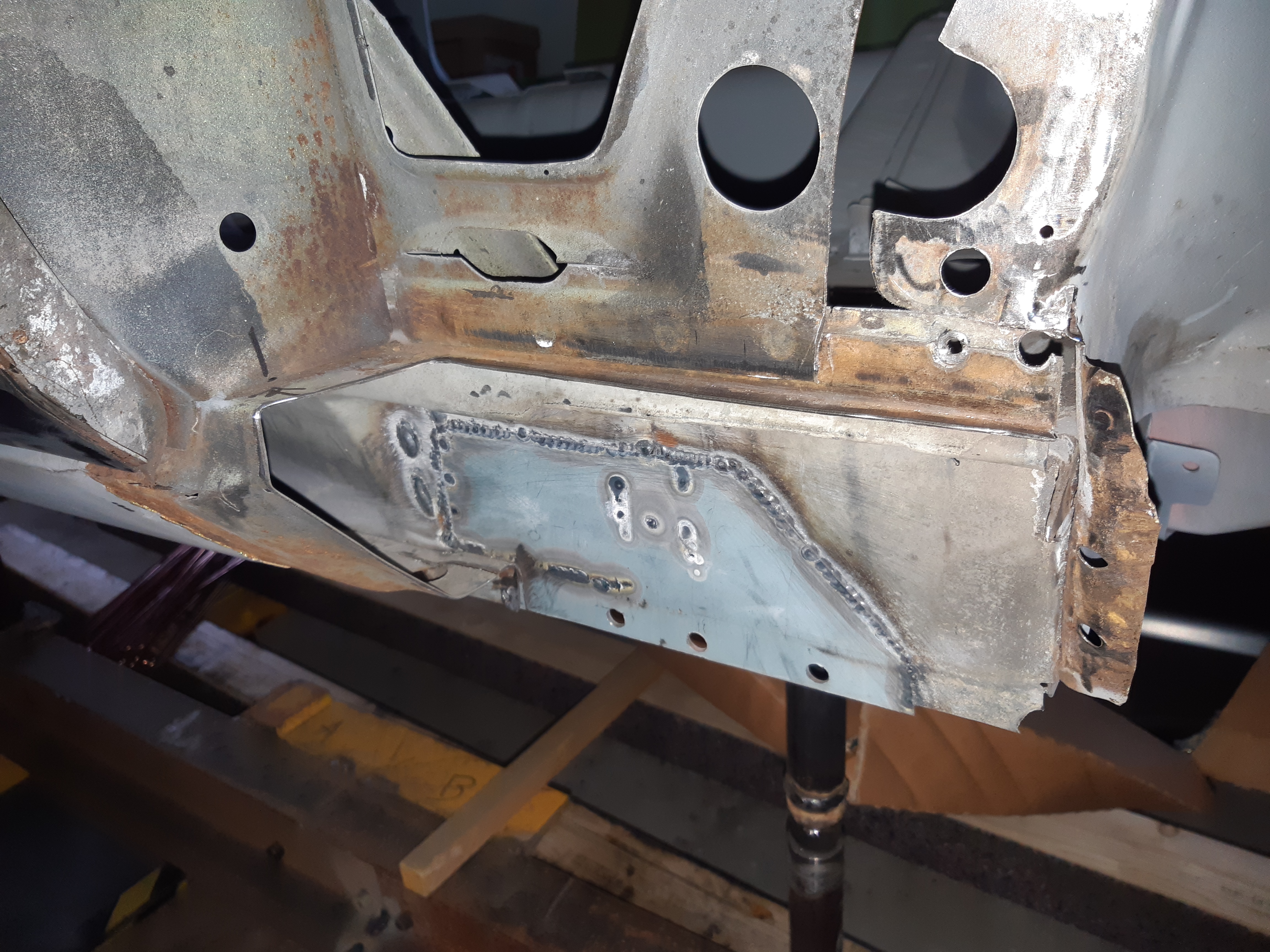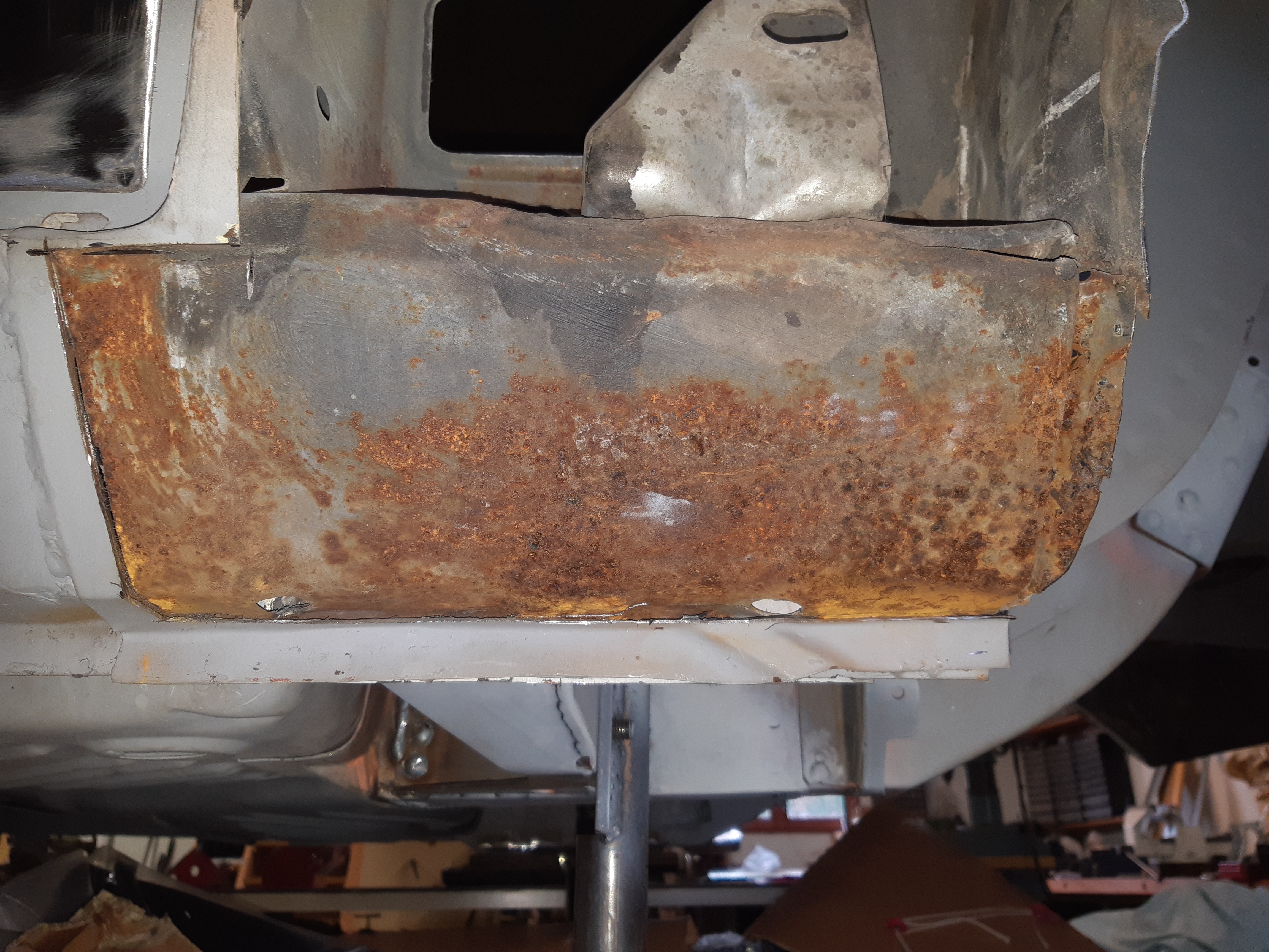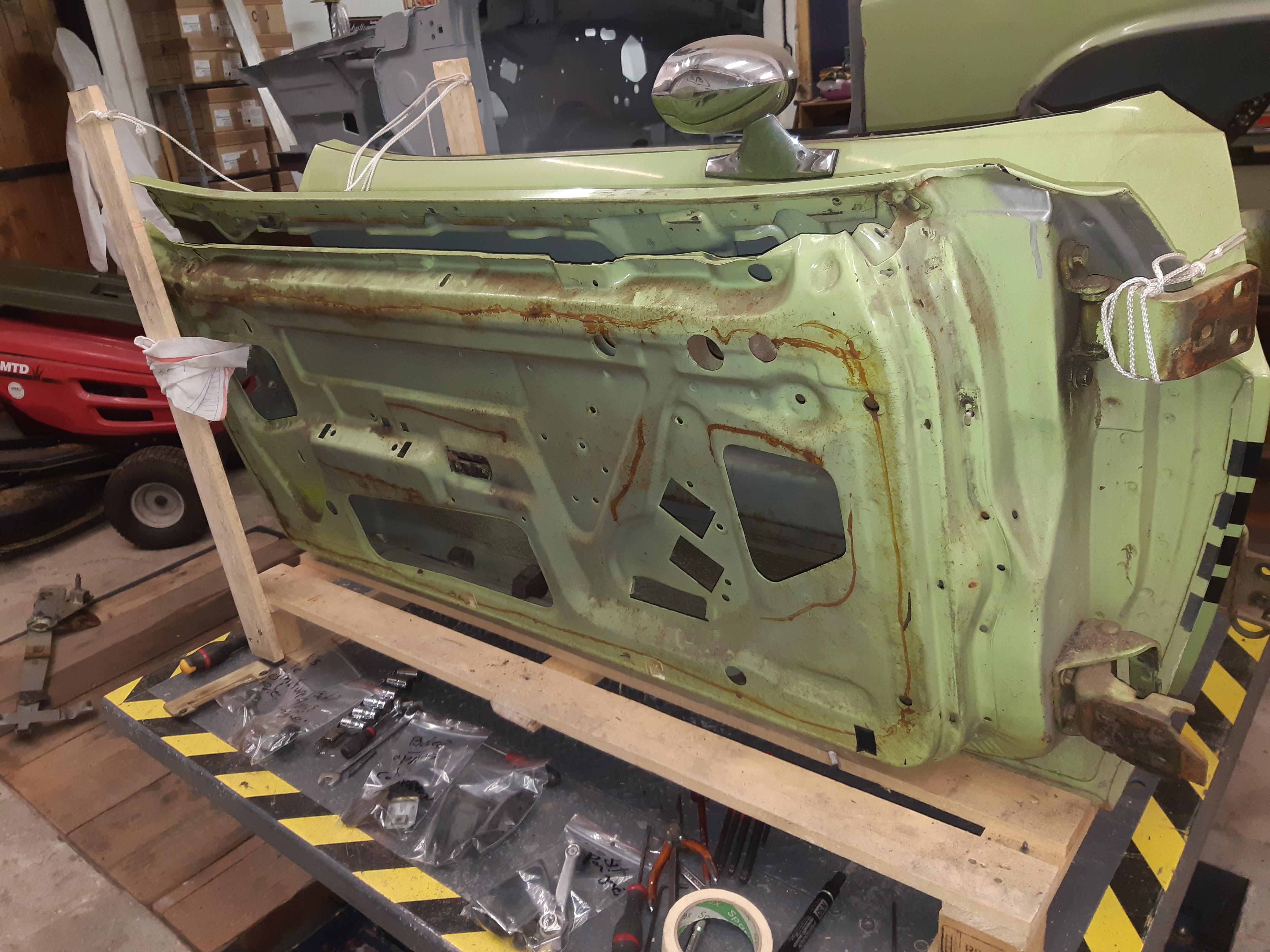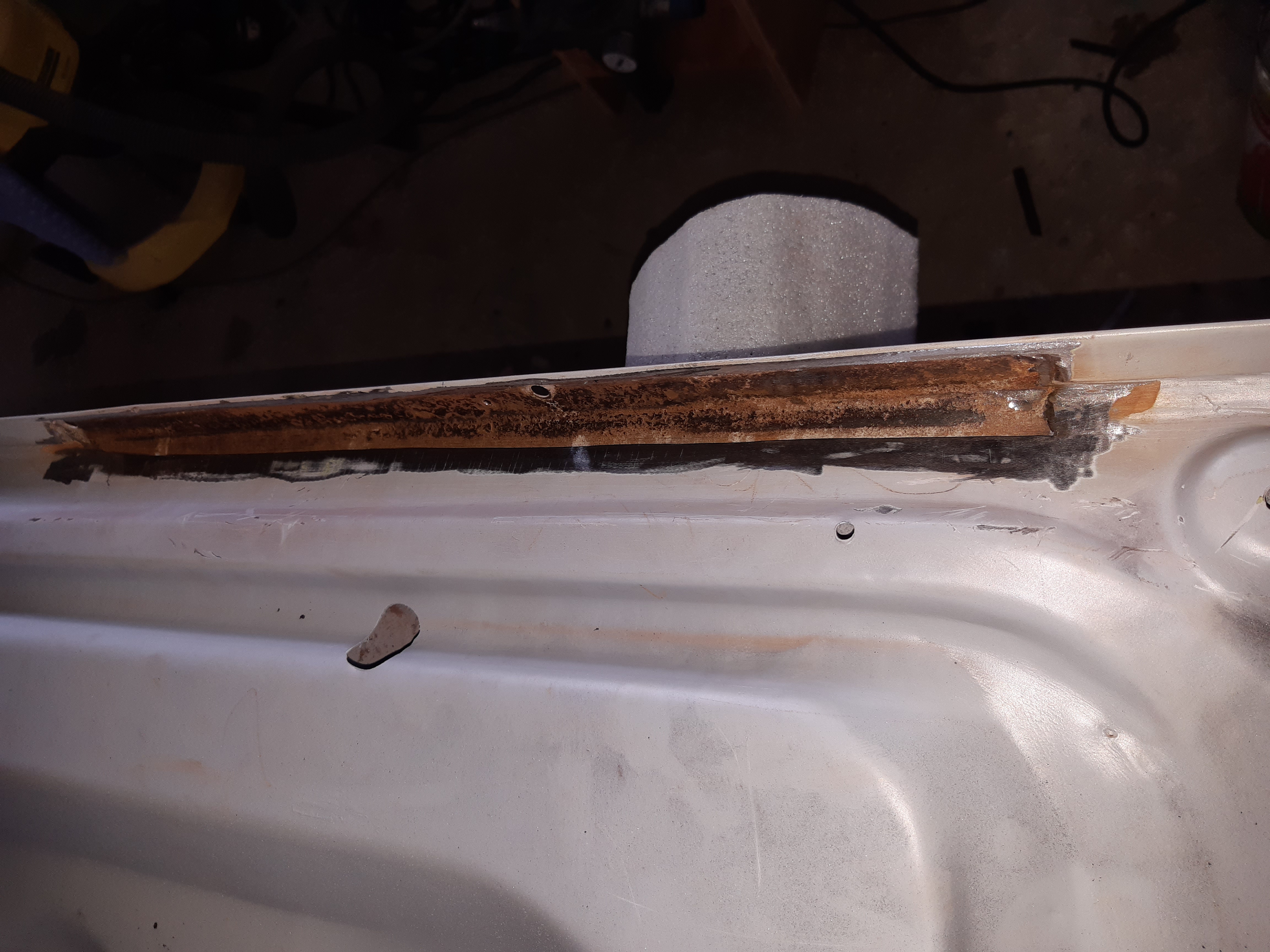 Avant d'attaquer la carrosserie, je ma suis dit que ce serait , peut-être , une bonne idée de la poser sur une sorte de "marbre" pour éviter qu'elle ne se tortille ,le but étant de changer les parties pourries, j'avais la feraille en stock donc GO ! une fois la caisse posée , démontage de la porte pour changement du panneau. Vu de la couche de mastic et l'état du panneau , pas de regrets ...