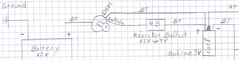 J'ai pourtant une bonne alimentation en 12v qui va au distributeur et j'ai branché le deuxième fil sur le - bobine. J'ai enlevé module d'allumage et le ballast.