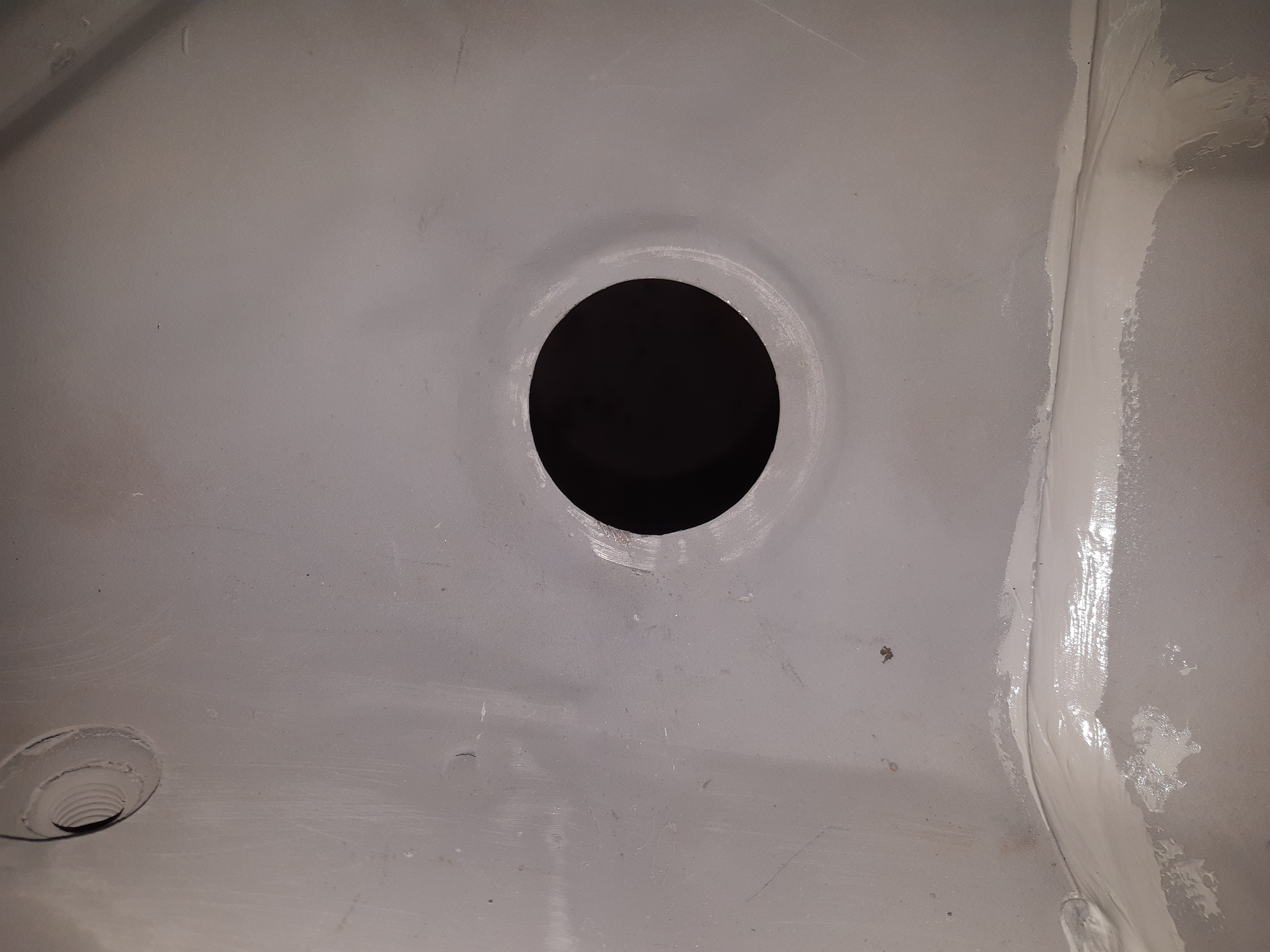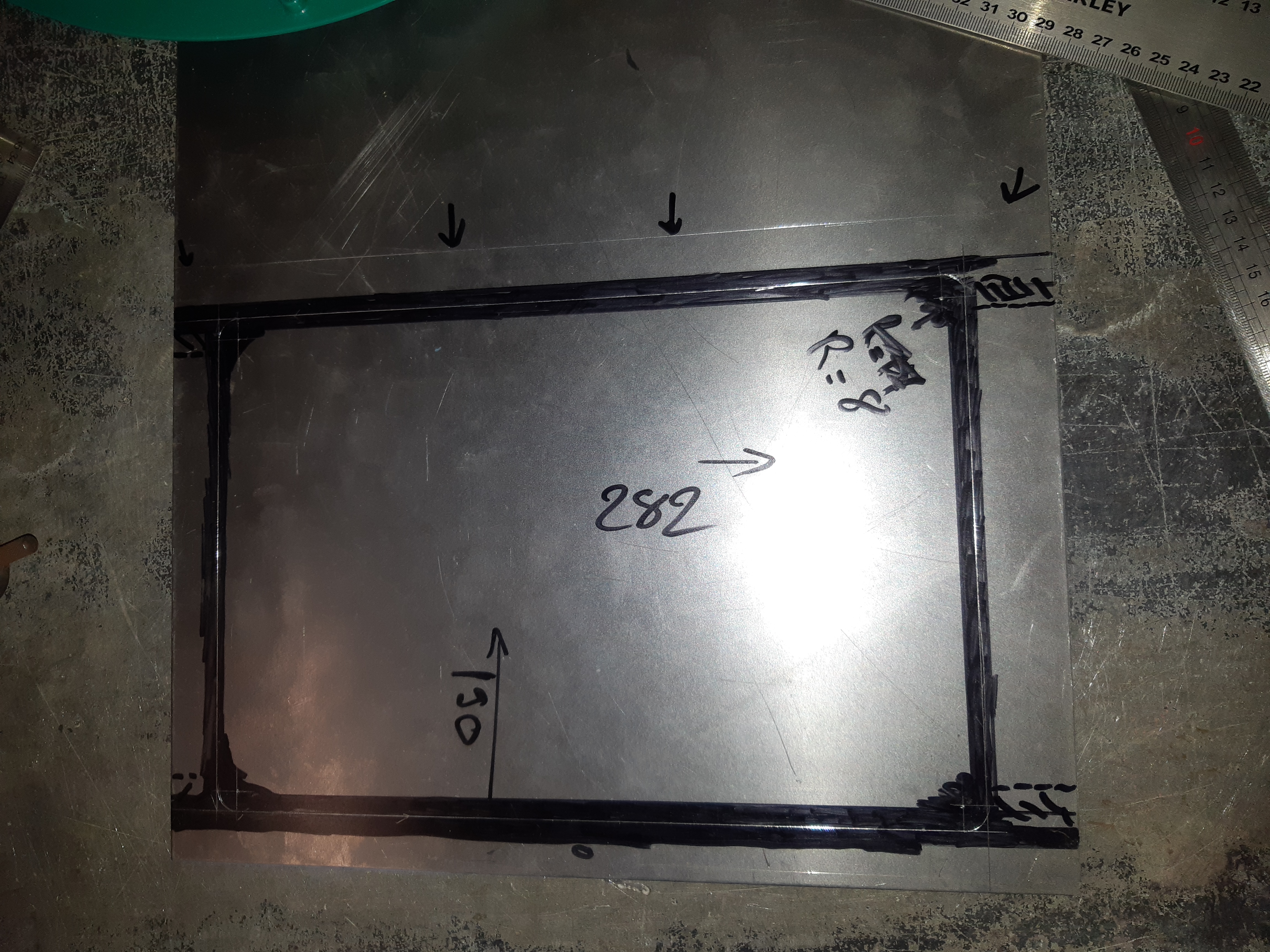 donc , réalisation d'une empreinte afin de donner un peu de nerf à la tôle puis traçage et réalisation des rebords Mais voyant le thermomètre remonter rapidos , j'abandonne tout pour passer une couche de peinture ! en cette saison , 20° c'est pas fréquent !